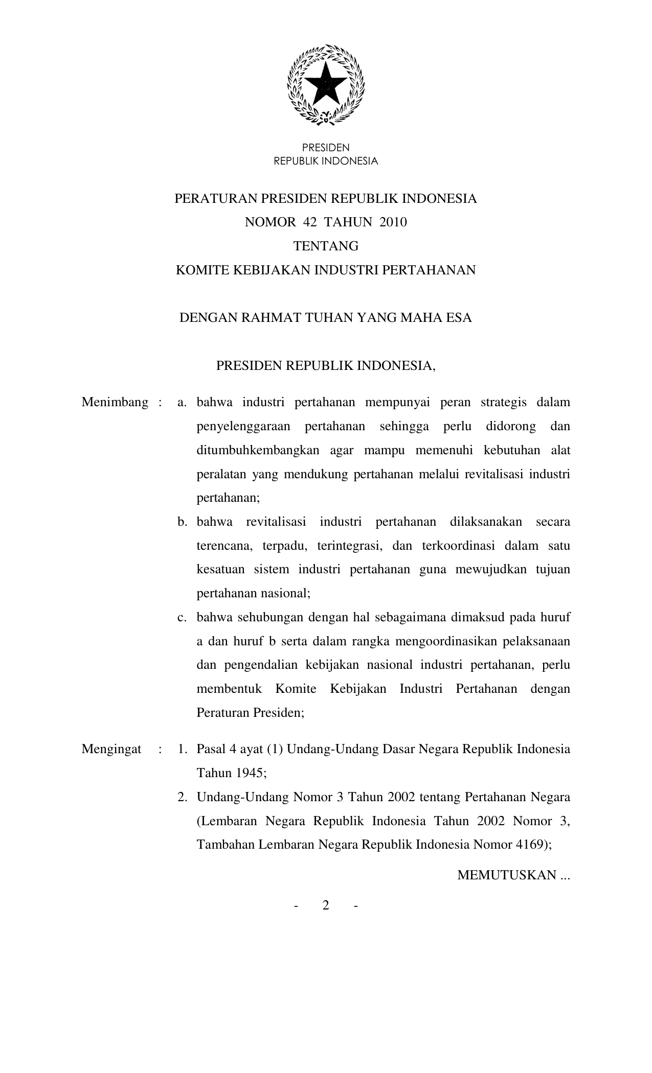 PERPRES Nomor 42 Tahun 2010 | Peraturan Presiden Nomor 42 Tahun 2010 tentang KOMITE KEBIJAKAN INDUSTRI PERTAHANAN