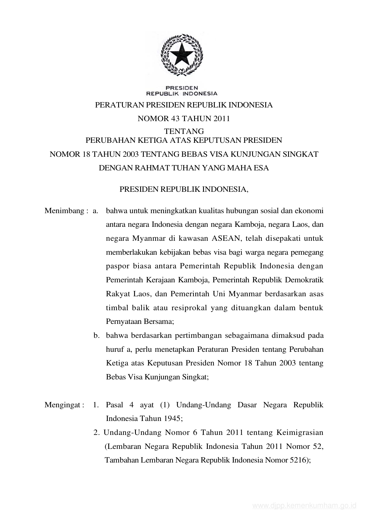 PERPRES Nomor 43 Tahun 2011 | Peraturan Presiden Nomor 43 Tahun 2011 tentang PERUBAHAN KETIGA ATAS KEPUTUSAN PRESIDEN NOMOR 18 TAHUN 2003 TENTANG BEBAS VISA KUNJUNGAN SINGKAT