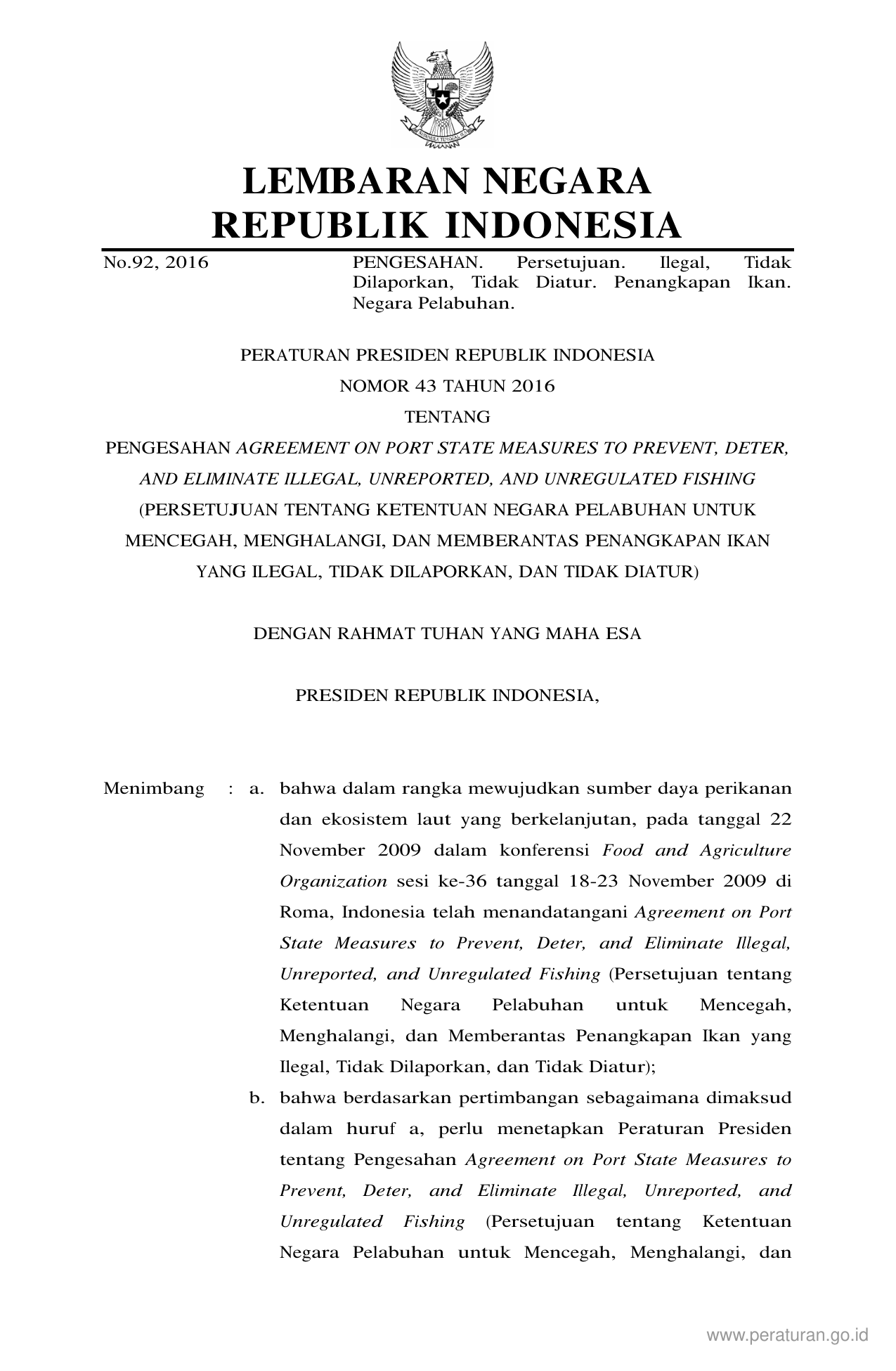 PERPRES Nomor 43 Tahun 2016 | Peraturan Presiden Nomor 43 Tahun 2016 tentang PENGESAHAN AGREEMENT ON PORT STATE MEASURES TO PREVENT, DETER, AND ELIMINATE ILLEGAL, UNREPORTED, AND UNREGULATED FISHING (PERSETUJUAN TENTANG KETENTUAN NEGARA PELABUHAN UNTUK MENCEGAH, MENGHALANGI, DAN MEMBERANTAS PENANGKAPAN IKAN YANG ILEGAL, TIDAK DILAPORKAN, DAN TIDAK DIATUR)