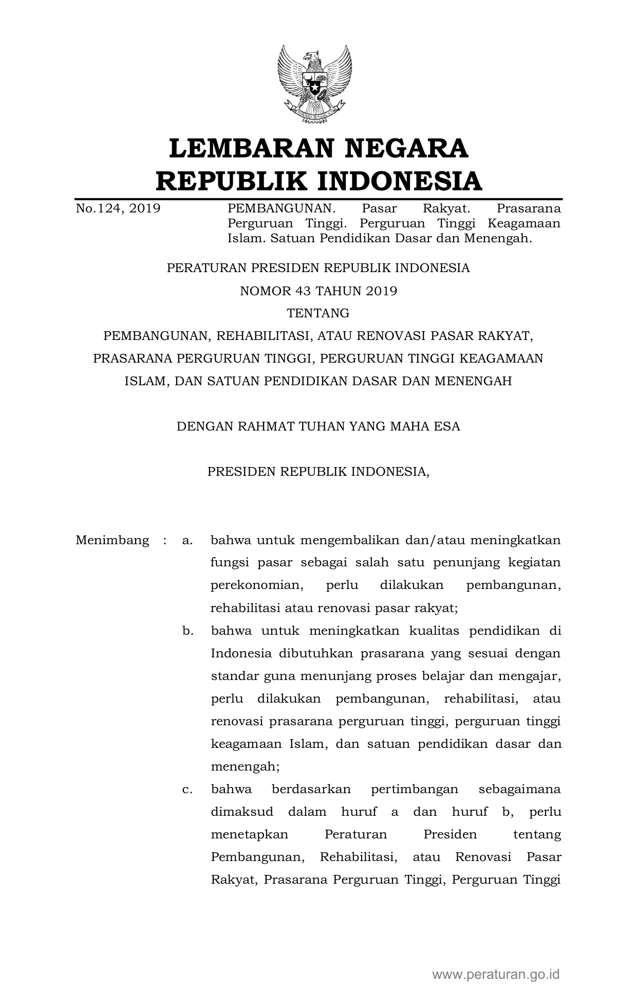 PERPRES Nomor 43 Tahun 2019 | Peraturan Presiden Nomor 43 Tahun 2019 tentang PEMBANGUNAN, REHABILITASI, ATAU RENOVASI PASAR RAKYAT, PRASARANA PERGURUAN TINGGI, PERGURUAN TINGGI KEAGAMAAN ISLAM, DAN SATUAN PENDIDIKAN DASAR DAN MENENGAH