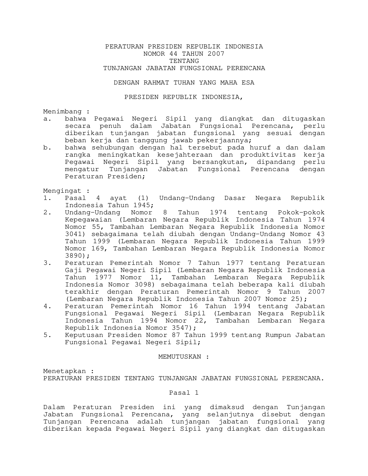 PERPRES Nomor 44 Tahun 2007 | Peraturan Presiden Nomor 44 Tahun 2007 tentang TUNJANGAN JABATAN FUNGSIONAL PERENCANA