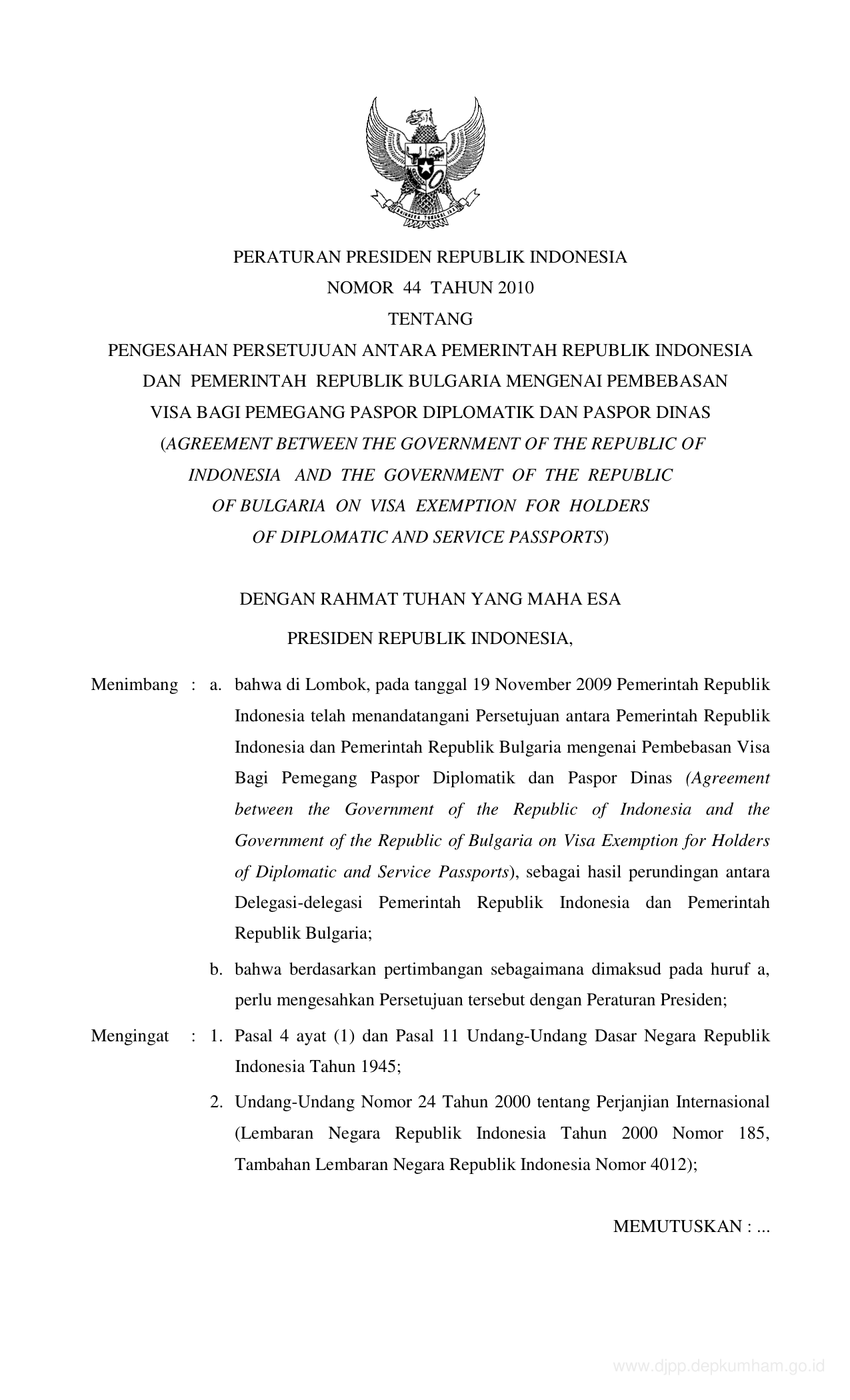 PERPRES Nomor 44 Tahun 2010 | Peraturan Presiden Nomor 44 Tahun 2010 tentang PENGESAHAN PERSETUJUAN ANTARA PEMERINTAH REPUBLIK INDONESIA DAN PEMERINTAH REPUBLIK BULGARIA MENGENAI PEMBEBASAN VISA BAGI PEMEGANG PASPOR DIPLOMATIK DAN PASPOR DINAS (AGREEMENT BETWEEN THE GOVERNMENT OF THE REPUBLIC OF INDONESIA AND THE GOVERNMENT OF THE REPUBLIC OF BULGARIA ON VISA EXEMPTION FOR HOLDERS OF DIPLOMATIC AND SERVICE PASSPORTS)