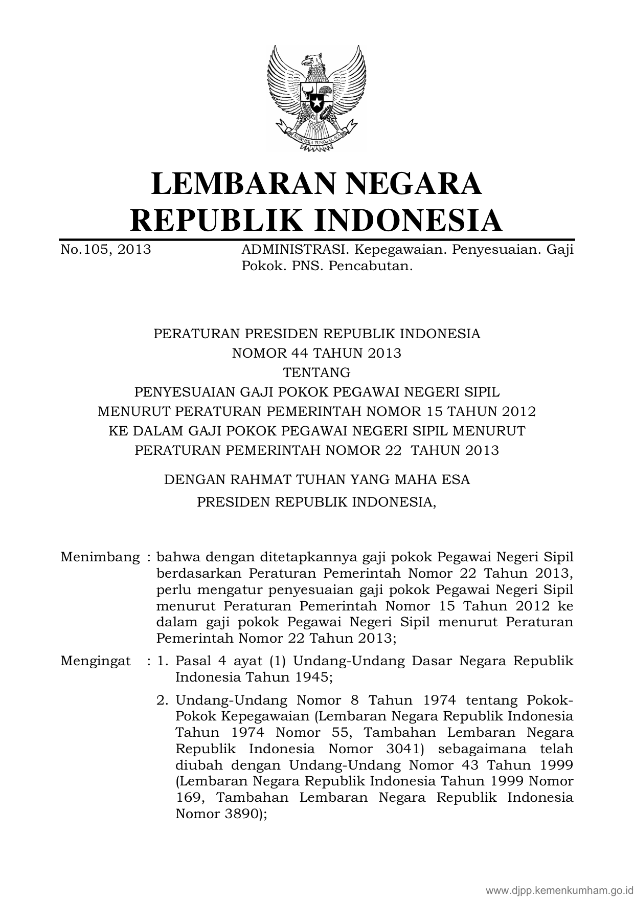 PERPRES Nomor 44 Tahun 2013 | Peraturan Presiden Nomor 44 Tahun 2013 tentang PENYESUAIAN GAJI POKOK PEGAWAI NEGERI SIPIL MENURUT PERATURAN PEMERINTAH NOMOR 15 TAHUN 2012 KE DALAM GAJI POKOK PEGAWAI NEGERI SIPIL MENURUT PERATURAN PEMERINTAH NOMOR 222 TAHUN 2013