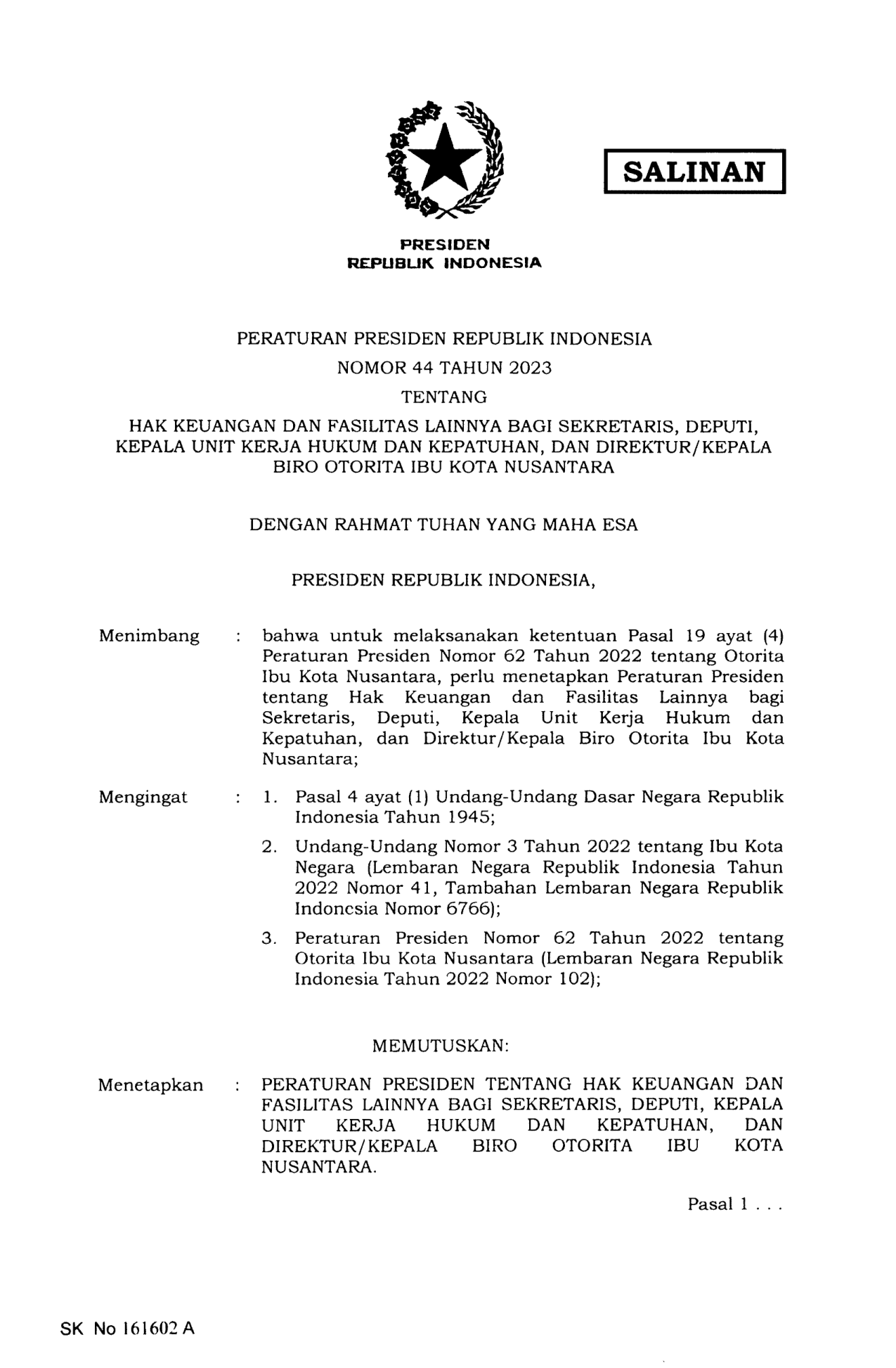 PERPRES Nomor 44 Tahun 2023 | Peraturan Presiden Nomor 44 Tahun 2023 tentang HAK KEUANGAN DAN FASILITAS LAINNYA BAGI SEKRETARIS, DEPUTI, KEPALA UNIT KERJA HUKUM DAN KEPATUHAN, DAN DIREKTUR/KEPALA BIRO OTORITA IBU KOTA NUSANTARA