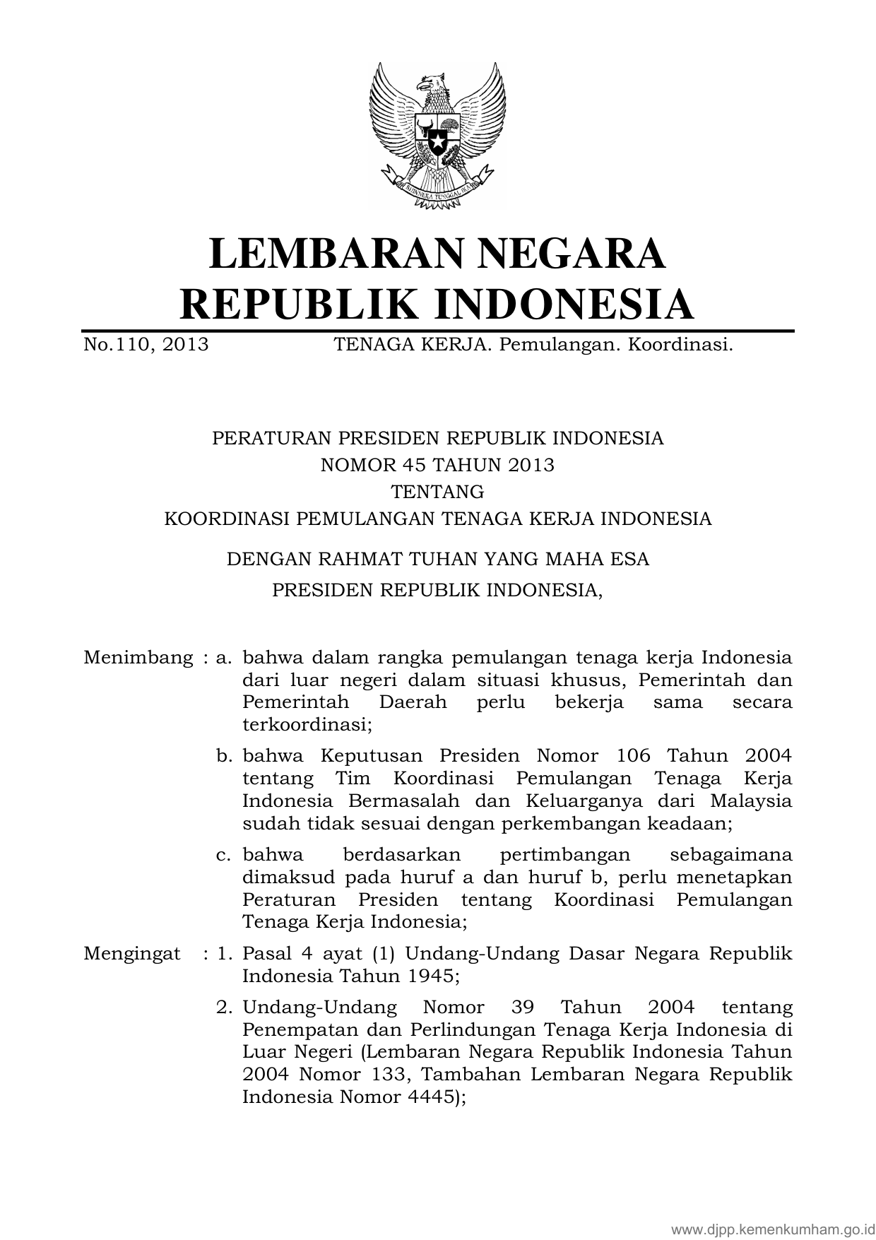PERPRES Nomor 45 Tahun 2013 | Peraturan Presiden Nomor 45 Tahun 2013 tentang KOORDINASI PEMULANGAN TENAGA KERJA INDONESIA