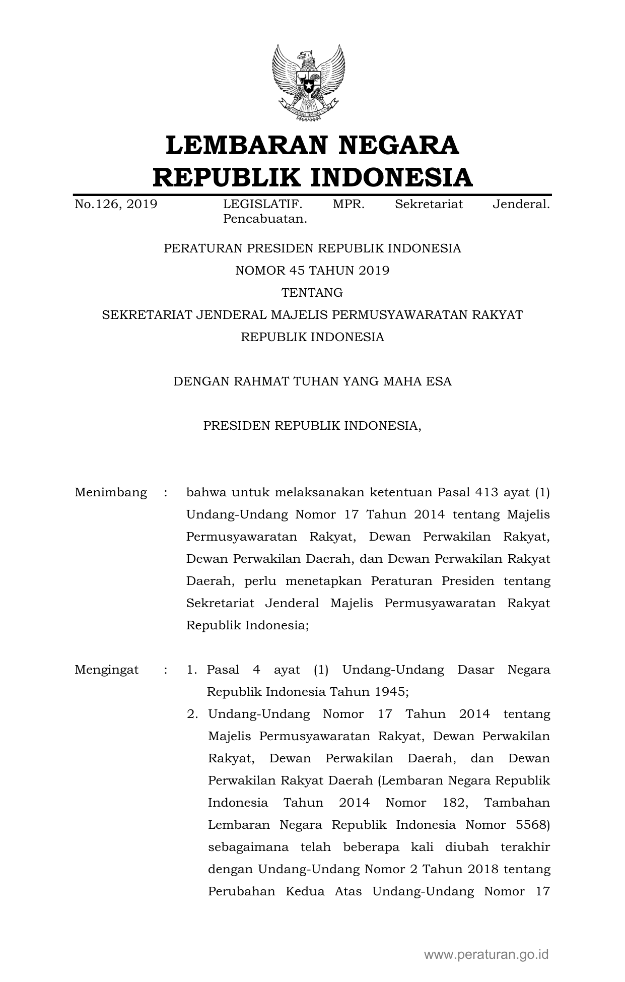 PERPRES Nomor 45 Tahun 2019 | Peraturan Presiden Nomor 45 Tahun 2019 tentang SEKRETARIAT JENDERAL MAJELIS PERMUSYAWARATAN RAKYAT REPUBLIK INDONESIA