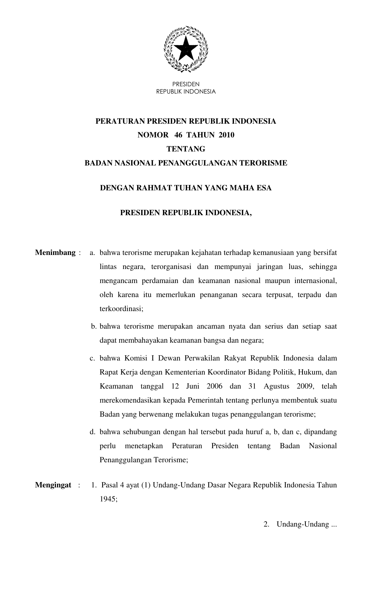 PERPRES Nomor 46 Tahun 2010 | Peraturan Presiden Nomor 46 Tahun 2010 tentang BADAN NASIONAL PENANGGULANGAN TERORISME