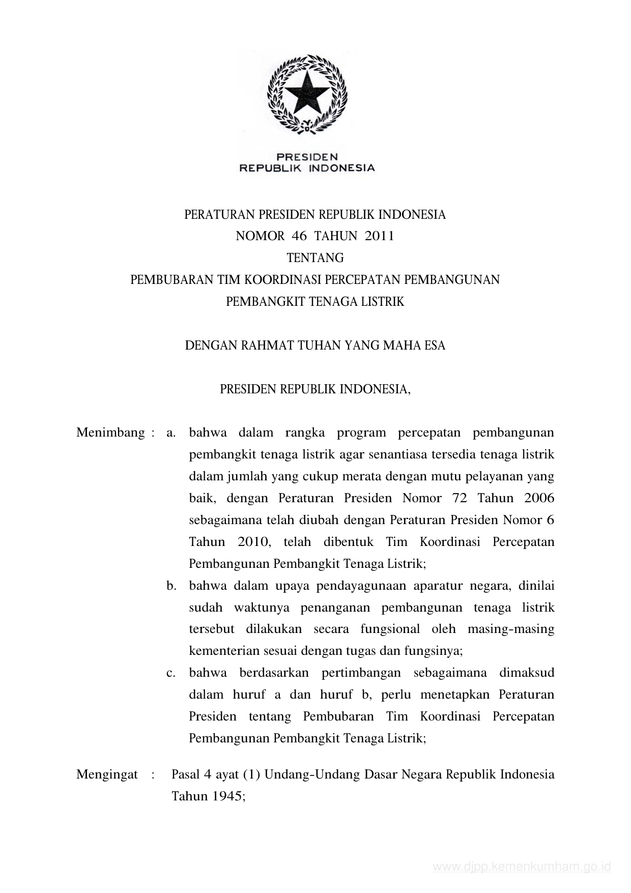 PERPRES Nomor 46 Tahun 2011 | Peraturan Presiden Nomor 46 Tahun 2011 tentang PEMBUBARAN TIM KOORDINASI PERCEPATAN PEMBANGUNAN PEMBANGKIT TENAGA LISTRIK