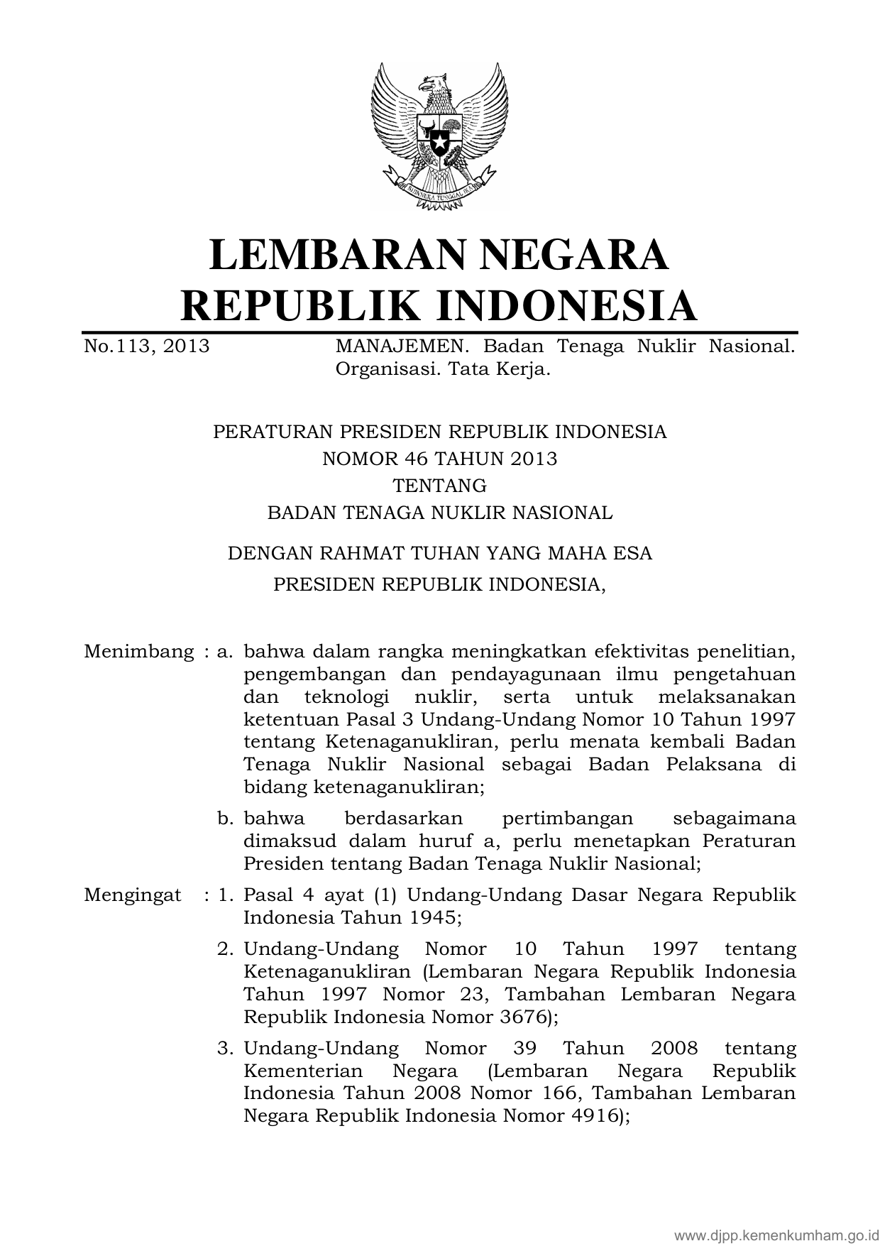 PERPRES Nomor 46 Tahun 2013 | Peraturan Presiden Nomor 46 Tahun 2013 tentang BADAN TENAGA NUKLIR NASIONAL