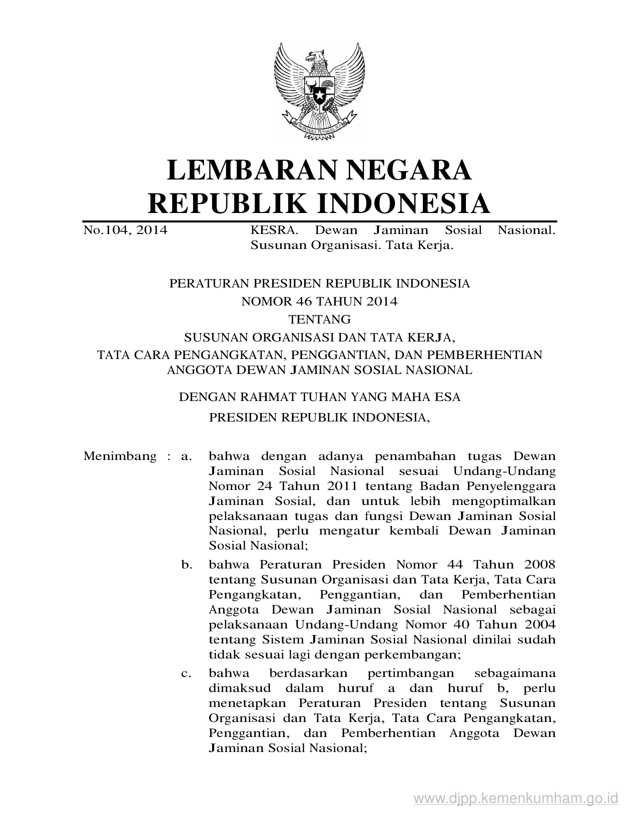 PERPRES Nomor 46 Tahun 2014 | Peraturan Presiden Nomor 46 Tahun 2014 tentang SUSUNAN ORGANISASI DAN TATA KERJA, TATA CARA PENGANGKATAN, PENGGANTIAN, DAN PEMBERHENTIAN ANGGOTA DEWAN JAMINAN SOSIAL NASIONAL
