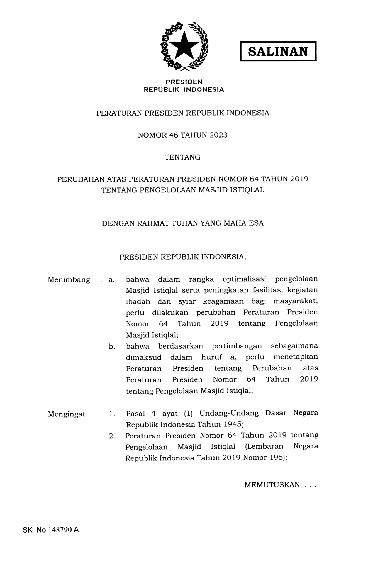 PERPRES Nomor 46 Tahun 2023 | Peraturan Presiden Nomor 46 Tahun 2023 tentang PERATURAN PRESIDEN REPUBLIK INDONESIANOMOR 46 TAHUN 2023TENTANGPERUBAHAN ATAS PERATURAN PRESIDEN NOMOR 64 TAHUN 2019TENTANG PENGELOLAAN MASJID ISTIQLAL