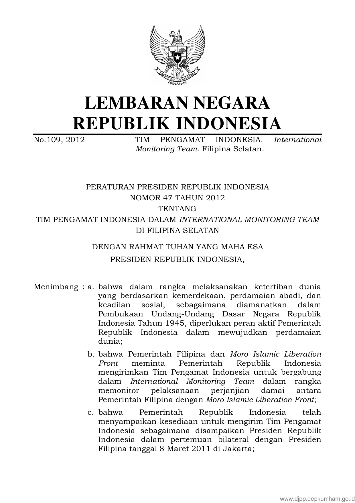 PERPRES Nomor 47 Tahun 2012 | Peraturan Presiden Nomor 47 Tahun 2012 tentang TIM PENGAMAT INDONESIA DALAM INTERNATIONAL MONITORING TEAM DI FILIPINA SELATAN