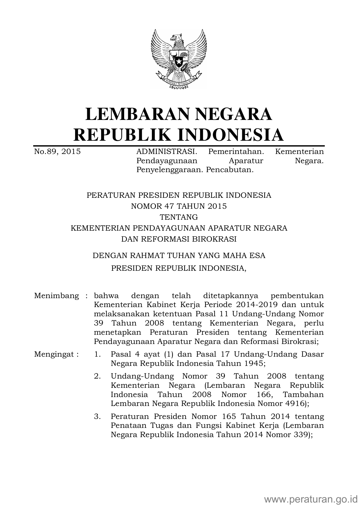 PERPRES Nomor 47 Tahun 2015 | Peraturan Presiden Nomor 47 Tahun 2015 tentang KEMENTERIAN PENDAYAGUNAAN APARATUR NEGARA DAN REFORMASI BIROKRASI