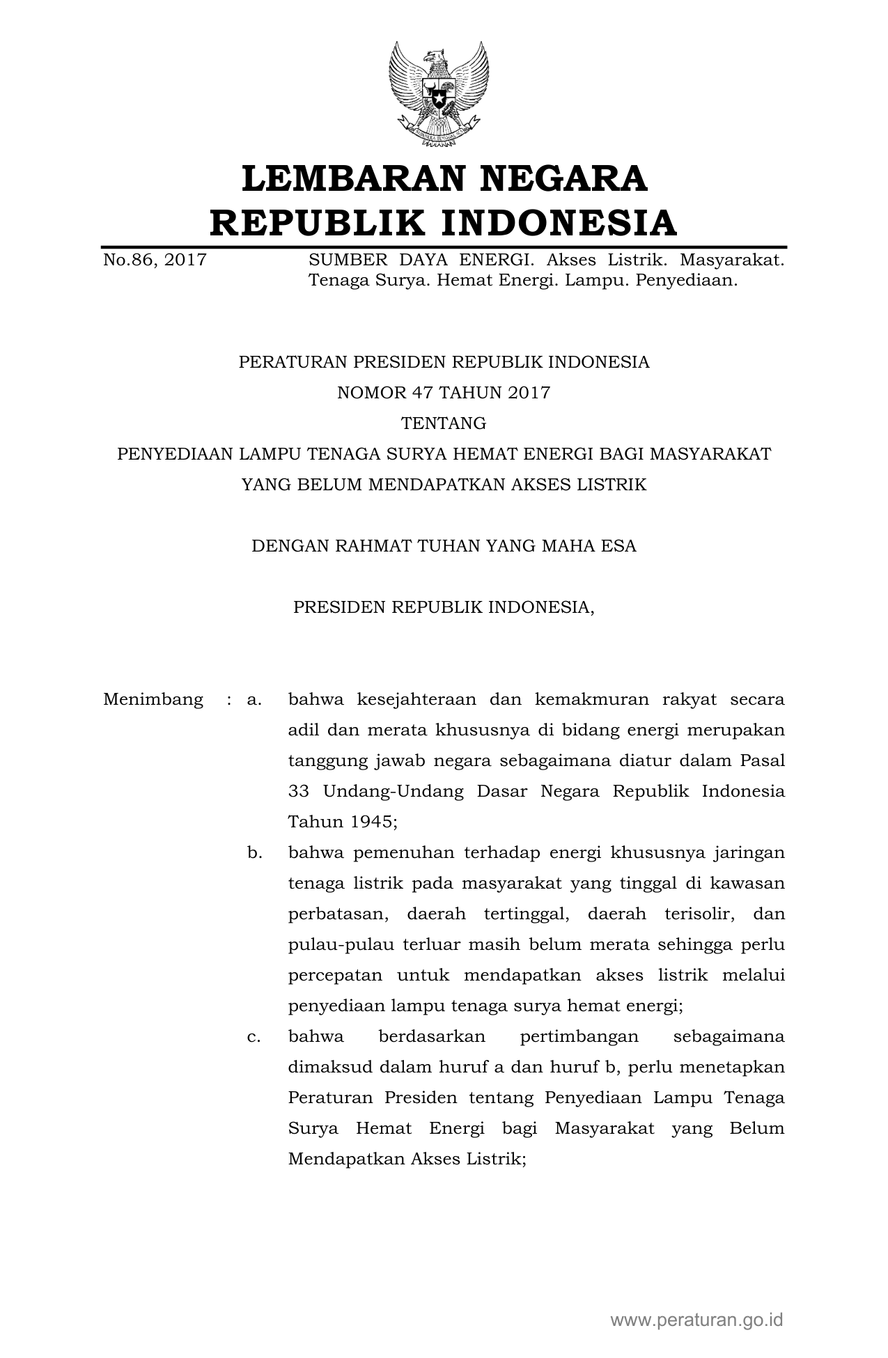PERPRES Nomor 47 Tahun 2017 | Peraturan Presiden Nomor 47 Tahun 2017 tentang Penyediaan Lampu Tenaga Surya Hemat Energi Bagi Masyarakat yang Belum Mendapatkan Akses Listrik