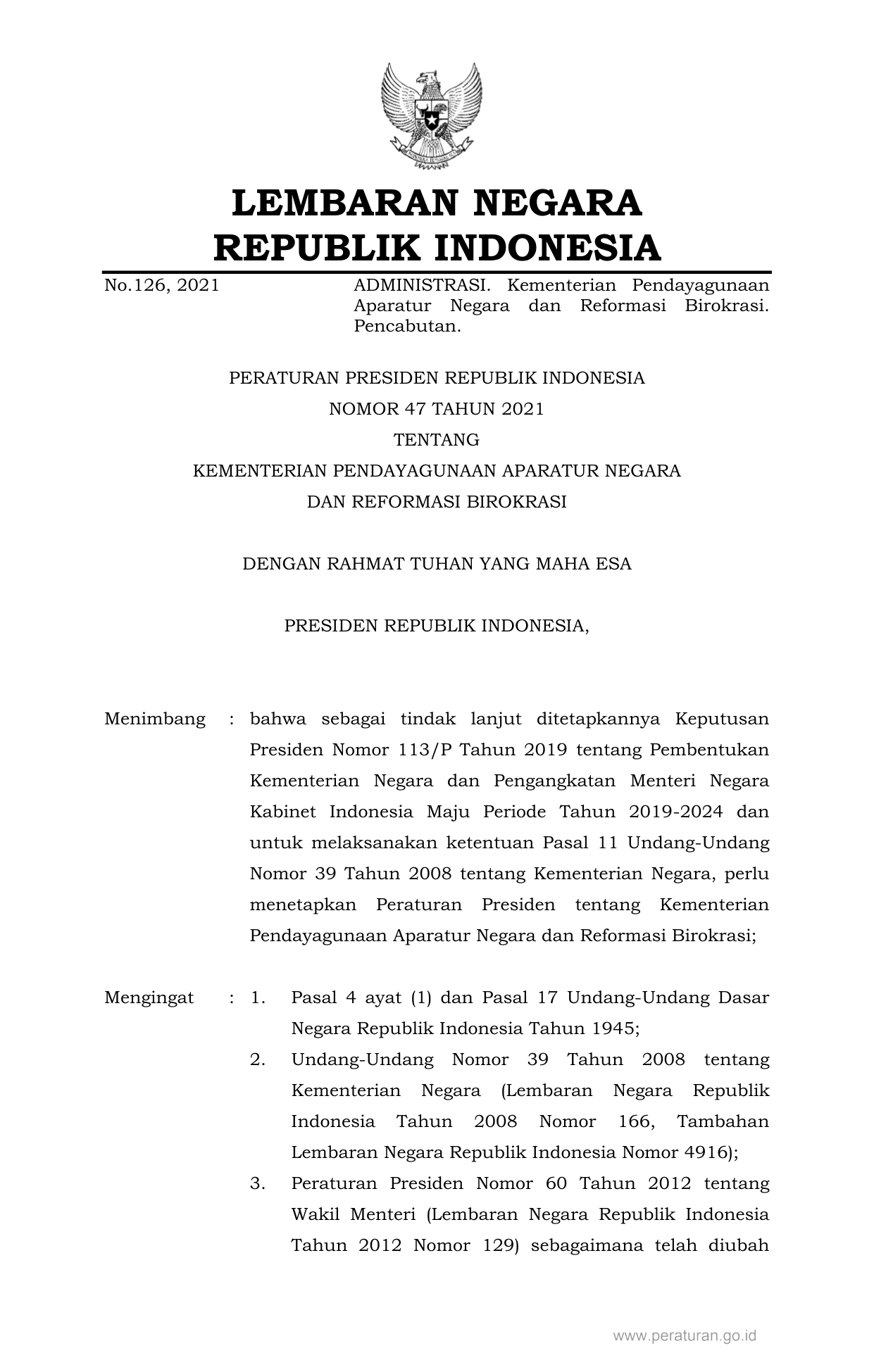 PERPRES Nomor 47 Tahun 2021 | Peraturan Presiden Nomor 47 Tahun 2021 tentang KEMENTERIAN PENDAYAGUNAAN APARATUR NEGARA DAN REFORMASI BIROKRASI