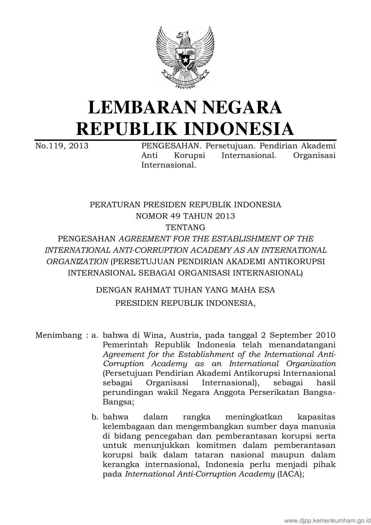 PERPRES Nomor 49 Tahun 2013 | Peraturan Presiden Nomor 49 Tahun 2013 tentang PENGESAHAN AGREEMENT FOR THE ESTABLISHMENT OF THE INTERNATIONAL ANTI-CORRUPTION ACADEMY AS AN INTERNATIONAL ORGANIZATION PERSETUJUAN PENDIRIAN AKADEMI ANTIKORUPSI INTERNASIONAL EBAGAI ORGANISASI INTERNASIONAL)