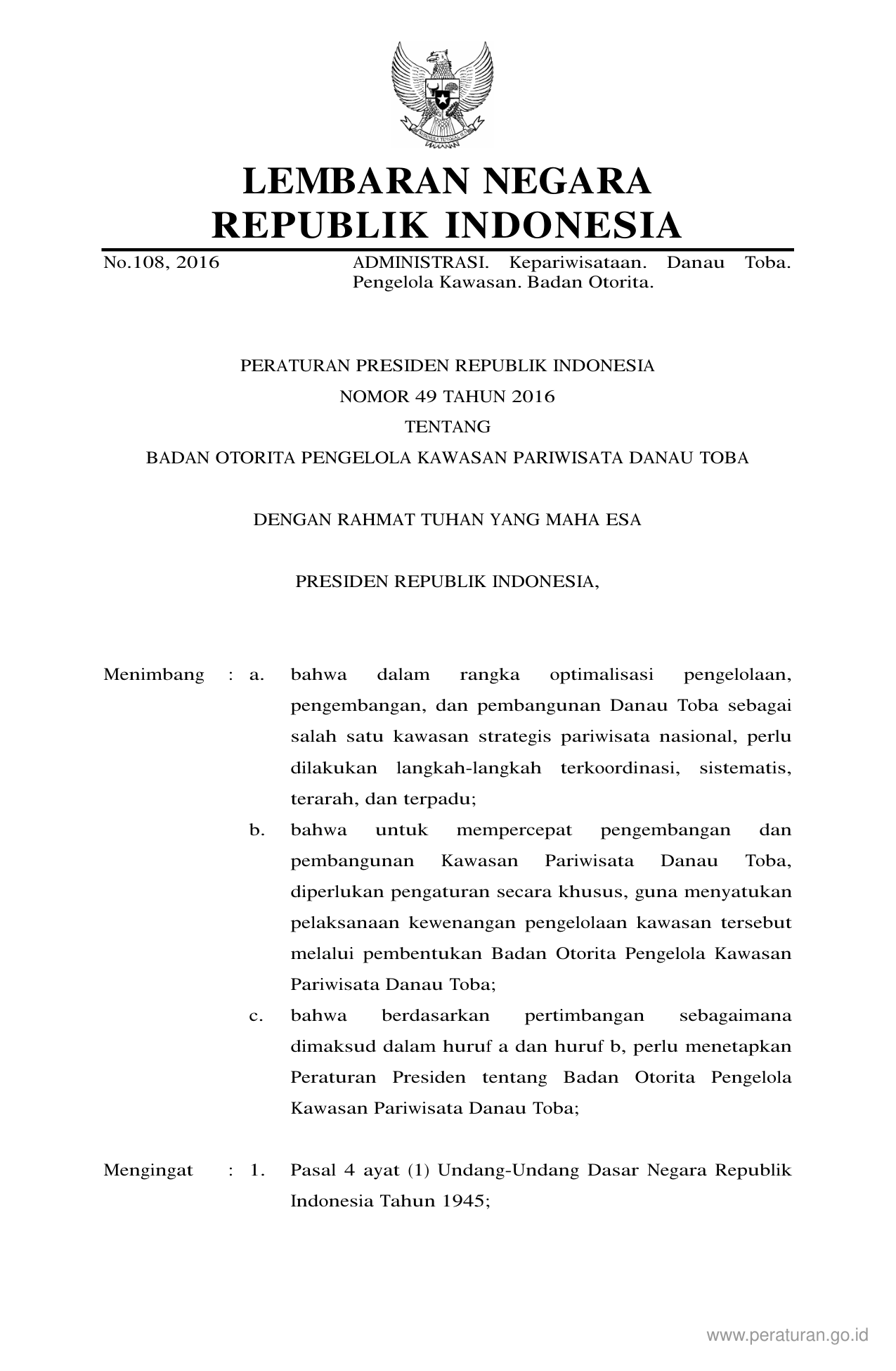 PERPRES Nomor 49 Tahun 2016 | Peraturan Presiden Nomor 49 Tahun 2016 tentang BADAN OTORITA PENGELOLA KAWASAN PARIWISATA DANAU TOBA