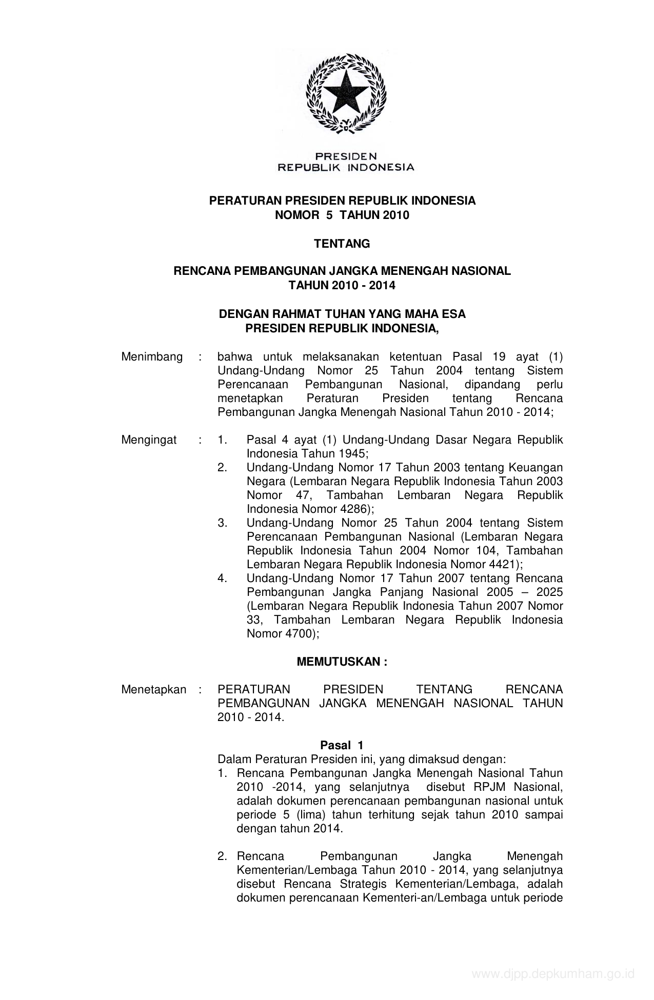 PERPRES Nomor 5 Tahun 2010 | Peraturan Presiden Nomor 5 Tahun 2010 tentang RENCANA PEMBANGUNAN JANGKA MENENGAH NASIONAL TAHUN 2010 - 2014