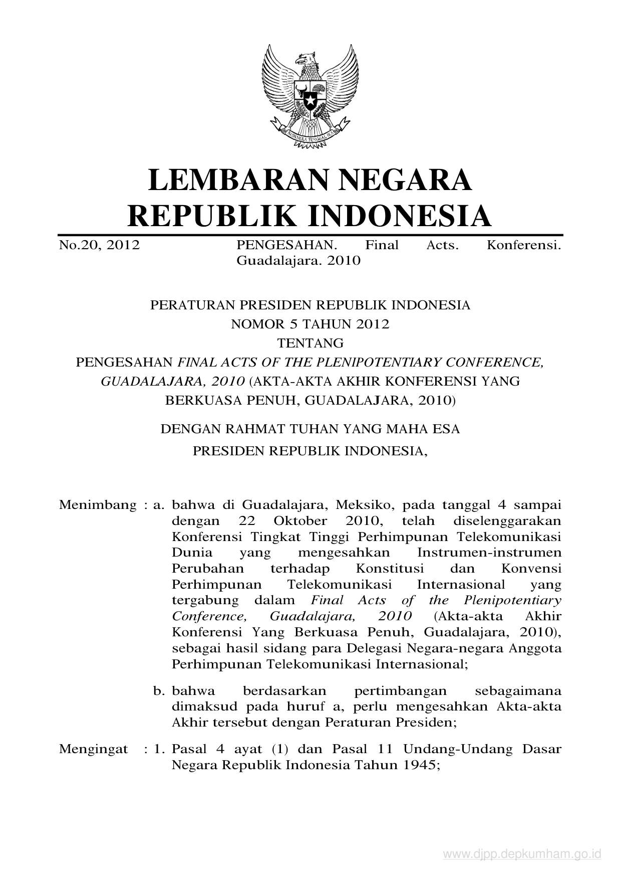 PERPRES Nomor 5 Tahun 2012 | Peraturan Presiden Nomor 5 Tahun 2012 tentang PENGESAHAN FINAL ACTS OF THE PLENIPOTENTIARY CONFERENCE, GUADALAJARA, 2010 (AKTA-AKTA AKHIR KONFERENSI YANG BERKUASA PENUH, GUADAJARA, 2010)