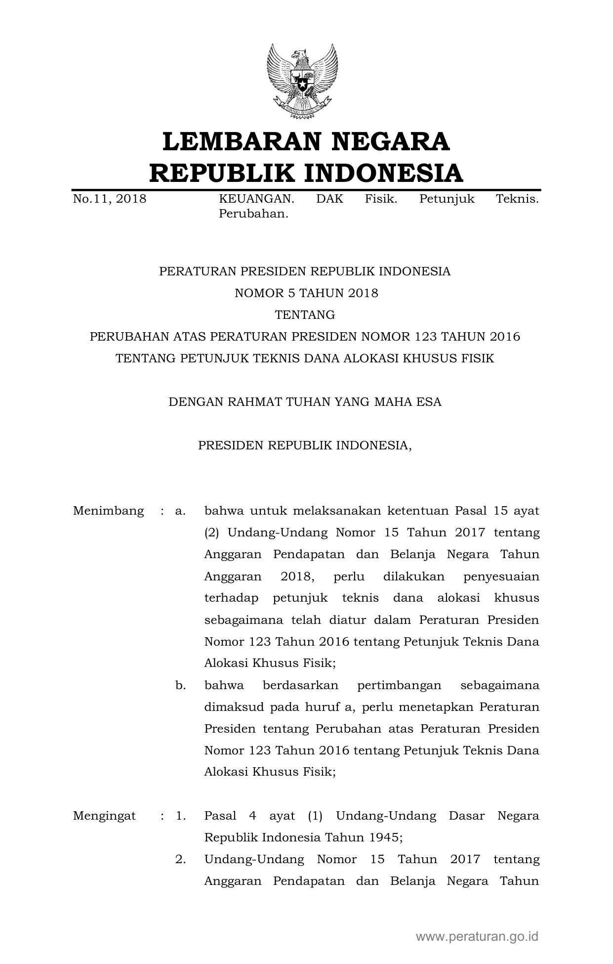 PERPRES Nomor 5 Tahun 2018 | Peraturan Presiden Nomor 5 Tahun 2018 tentang Perubahan atas Peraturan Presiden Nomor 123 Tahun 2016 tentang Petunjuk Teknis Dana Alokasi Khusus Fisik
