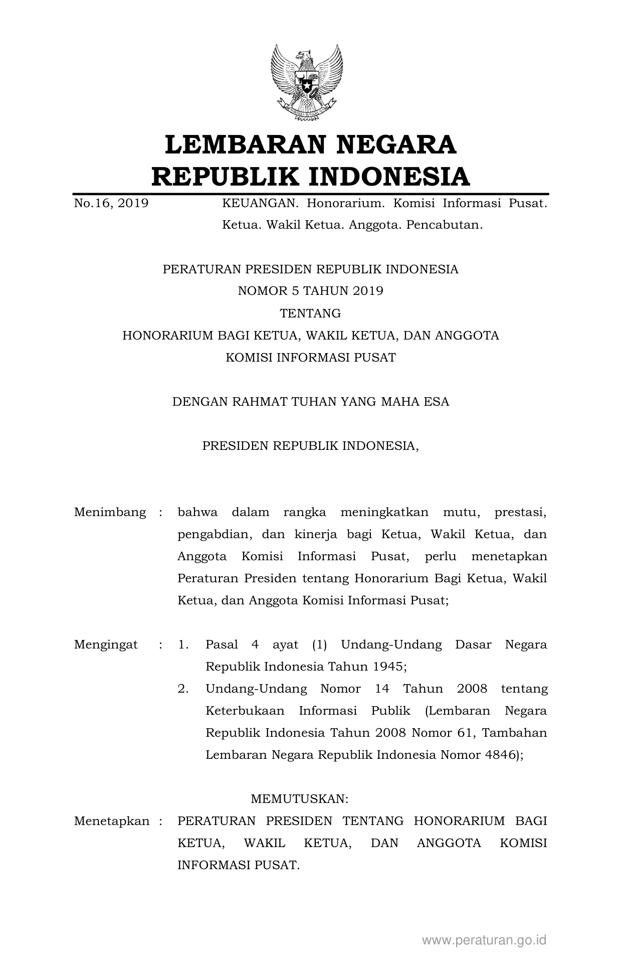 PERPRES Nomor 5 Tahun 2019 | Peraturan Presiden Nomor 5 Tahun 2019 tentang HONORARIUM BAGI KETUA, WAKIL KETUA, DAN ANGGOTA KOMISI INFORMASI PUSAT