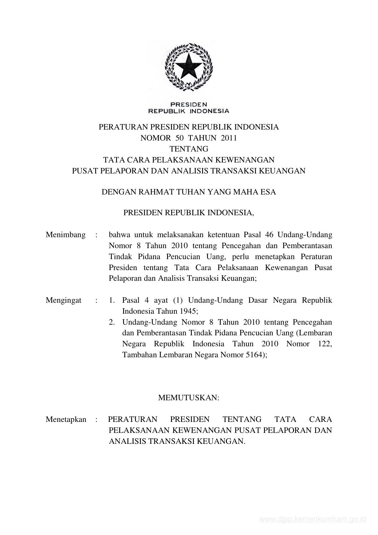 PERPRES Nomor 50 Tahun 2011 | Peraturan Presiden Nomor 50 Tahun 2011 tentang TATA CARA PELAKSANAAN KEWENANGAN PUSAT PELAPORAN DAN ANALISIS TRANSAKSI KEUANGAN