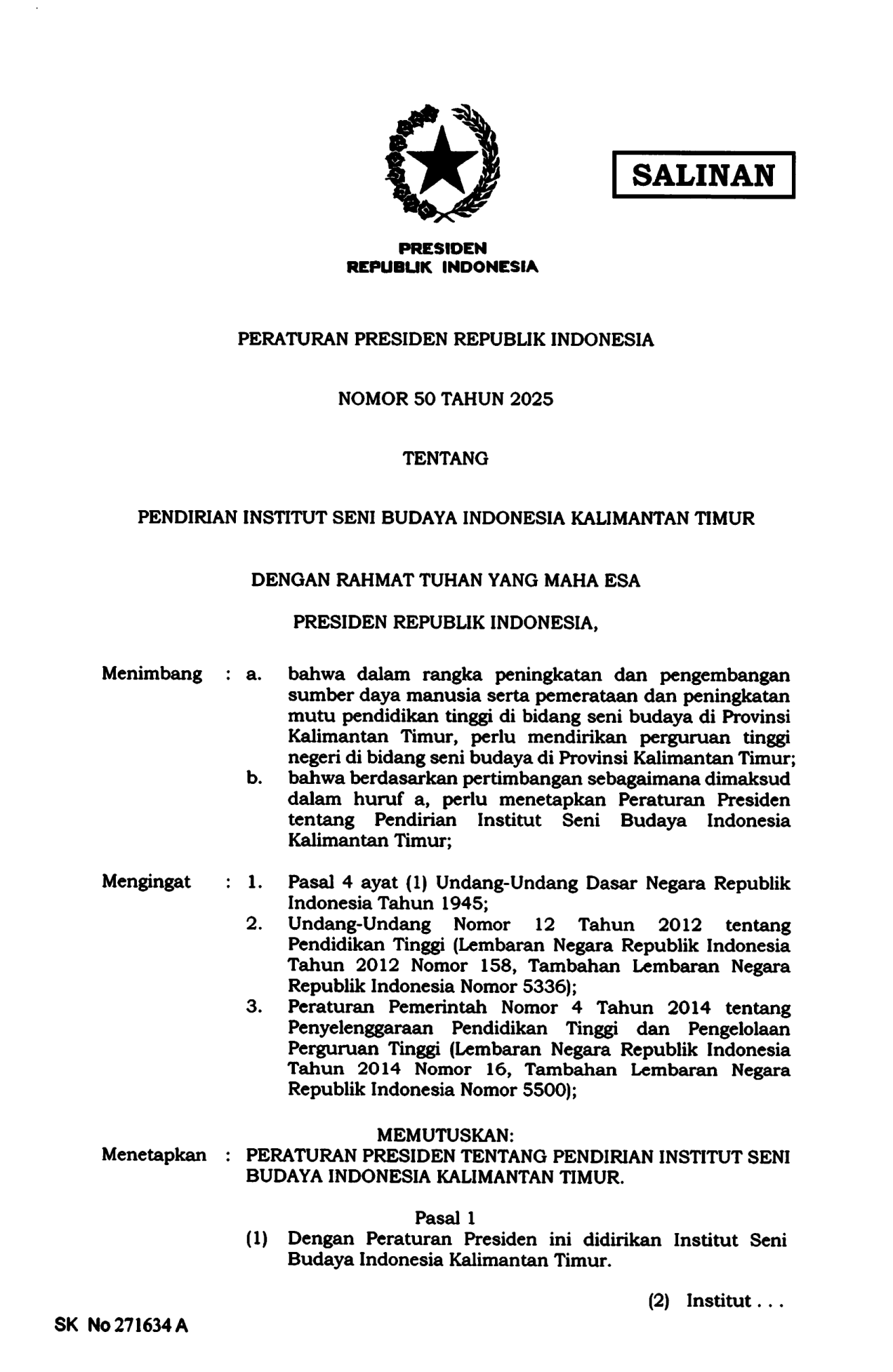 PERPRES Nomor 50 Tahun 2025 | Peraturan Presiden Nomor 50 Tahun 2025 tentang Pendirian Institut Seni Budaya Indonesia Kalimantan Timur