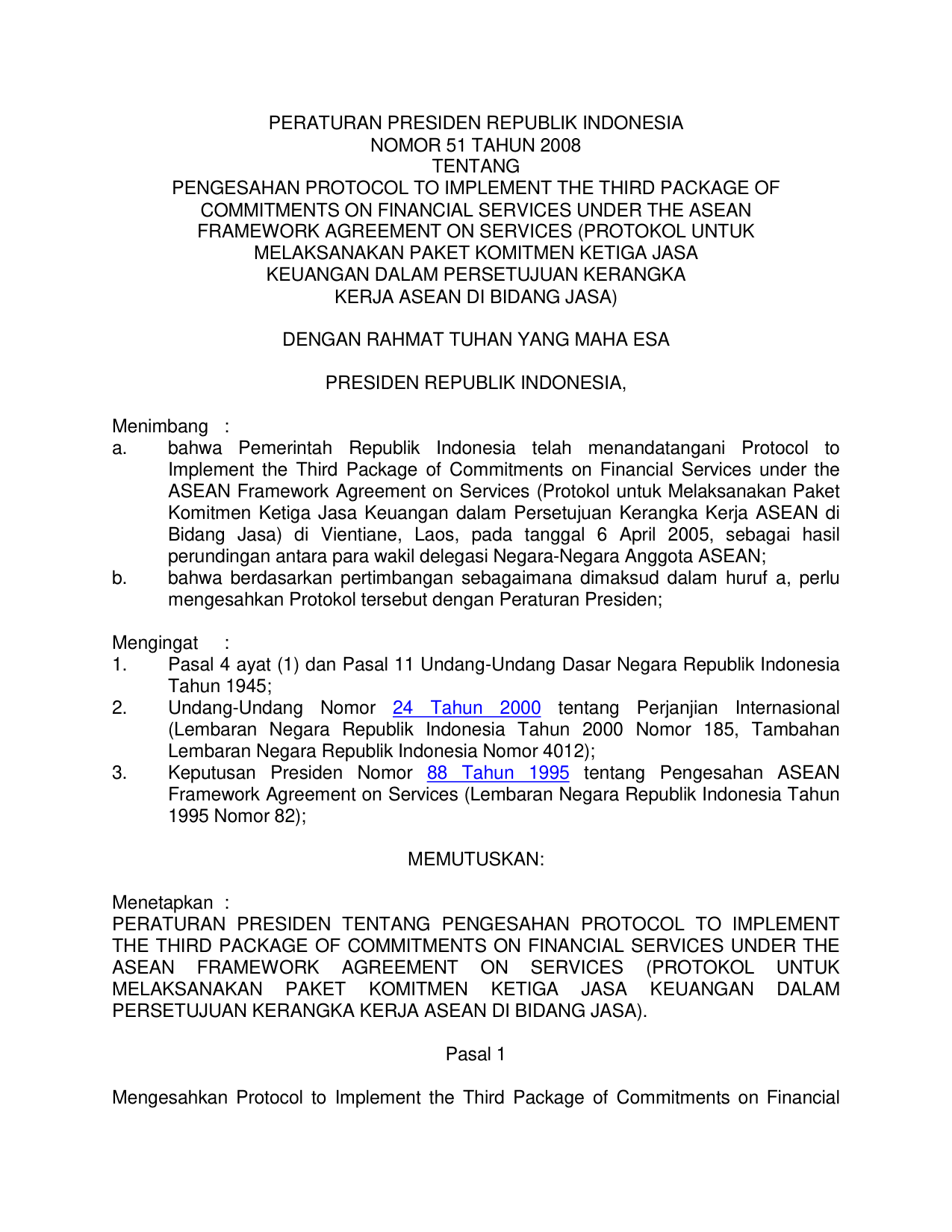 PERPRES Nomor 51 Tahun 2008 | Peraturan Presiden Nomor 51 Tahun 2008 tentang PENGESAHAN PROTOCOL TO IMPLEMENT THE THIRD PACKAGE OF COMMITMENTS ON FINANCIAL SERVICES UNDER THE ASEAN FRAMEWORK AGREEMENT ON SERVICES (PROTOKOL UNTUK MELAKSANAKAN PAKET KETIGA KOMITMEN JASA KEUANGAN DALAM PERSETUJUAN KERANGKA KERJA ASEAN DI BIDANG JASA)