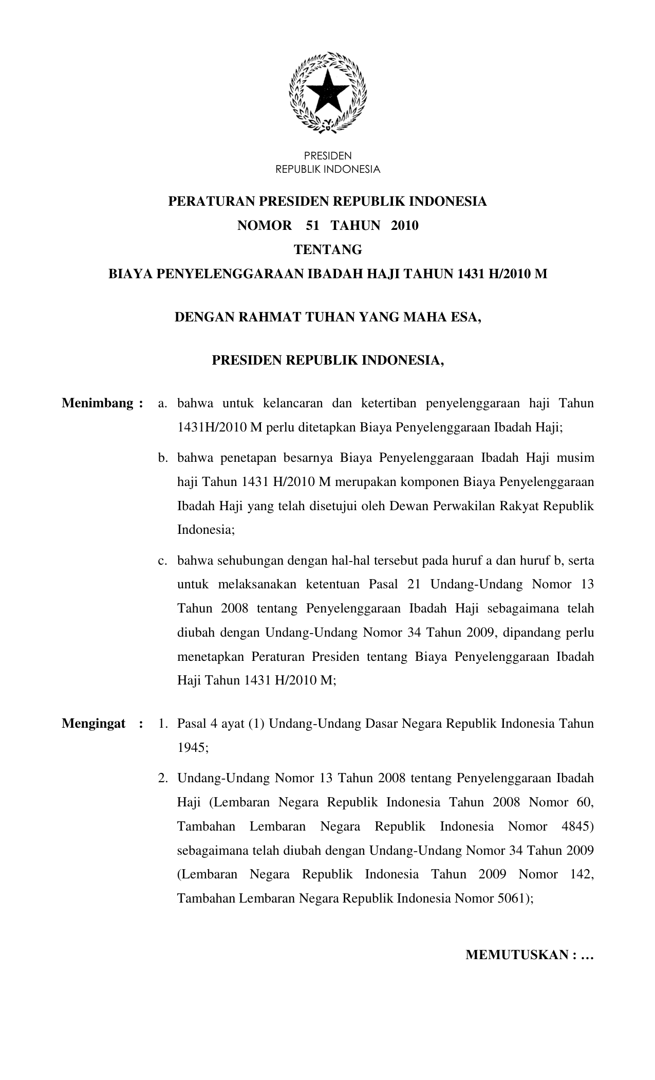 PERPRES Nomor 51 Tahun 2010 | Peraturan Presiden Nomor 51 Tahun 2010 tentang BIAYA PENYELENGGARAAN IBADAH HAJI TAHUN 1431 H/2010 M