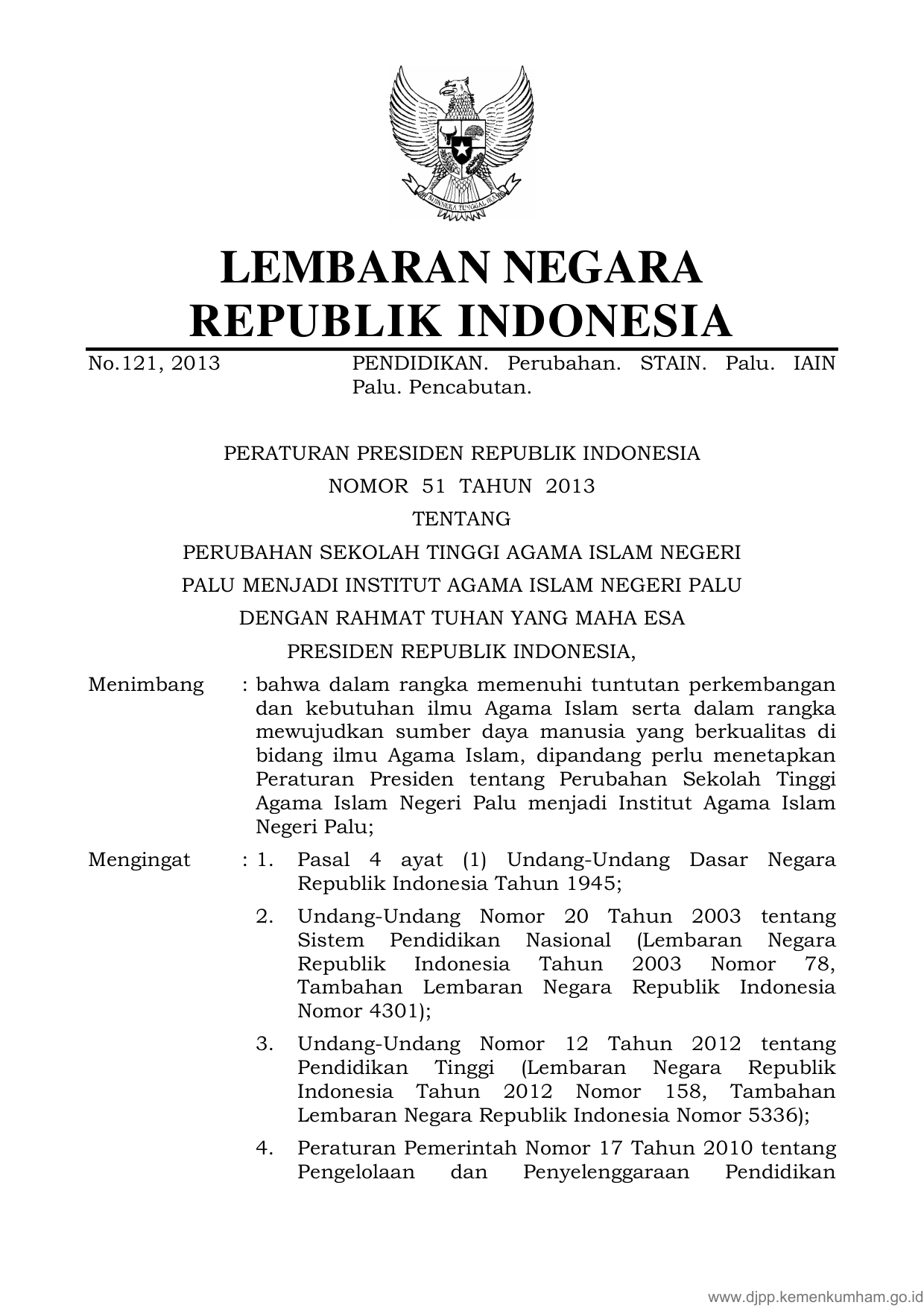 PERPRES Nomor 51 Tahun 2013 | Peraturan Presiden Nomor 51 Tahun 2013 tentang PERUBAHAN SEKOLAH TINGGI AGAMA ISLAM NEGERI PALU MENJADI INSTITUT AGAMA ISLAM NEGERI PALU