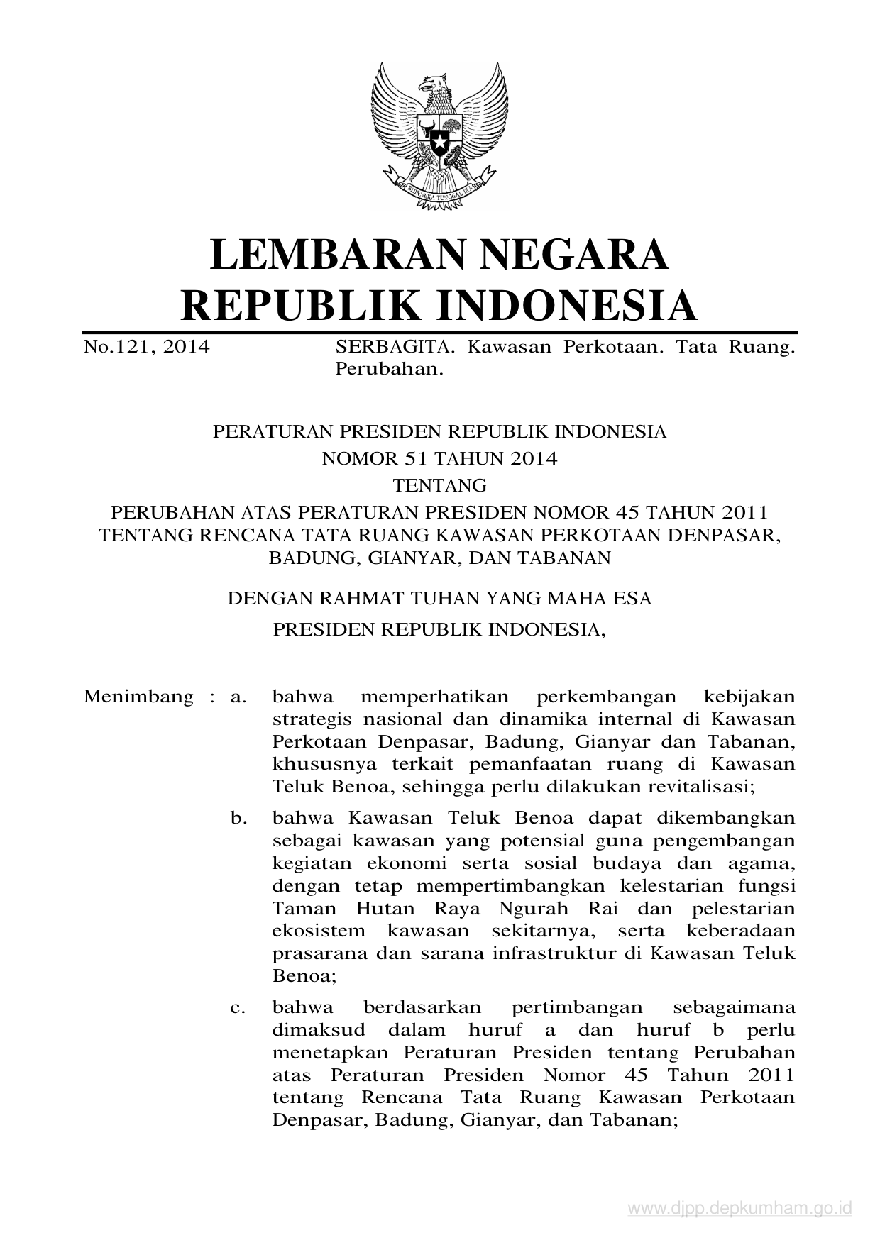 PERPRES Nomor 51 Tahun 2014 | Peraturan Presiden Nomor 51 Tahun 2014 tentang PERUBAHAN ATAS PERATURAN PRESIDEN NOMOR 45 TAHUN 2011 TENTANG RENCANA TATA RUANG KAWASAN PERKOTAAN DENPASAR, BADUNG, GIANYAR, DAN TABANAN