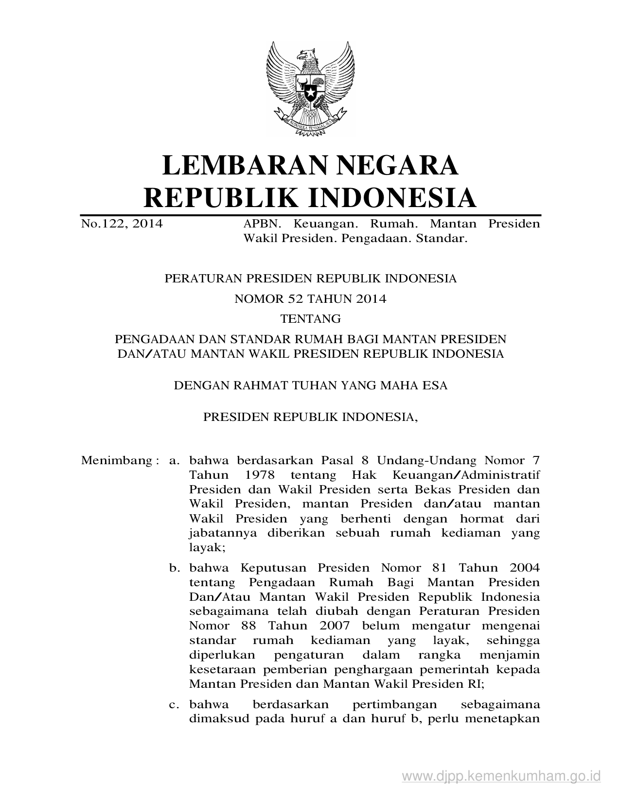 PERPRES Nomor 52 Tahun 2014 | Peraturan Presiden Nomor 52 Tahun 2014 tentang PENGADAAN DAN STANDAR RUMAH BAGI MANTAN PRESIDEN DAN/ATAU MANTAN WAKIL PRESIDEN REPUBLIK INDONESIA