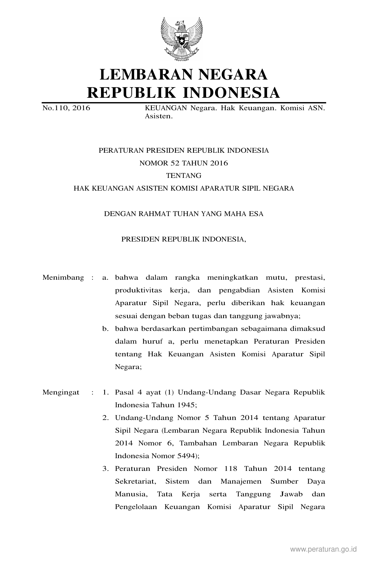 PERPRES Nomor 52 Tahun 2016 | Peraturan Presiden Nomor 52 Tahun 2016 tentang HAK KEUANGAN ASISTEN KOMISI APARATUR SIPIL NEGARA