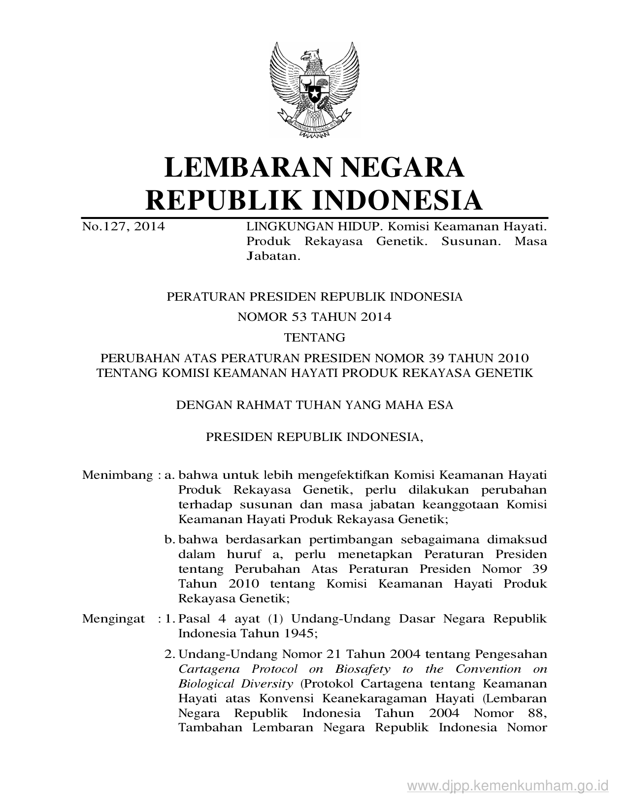 PERPRES Nomor 53 Tahun 2014 | Peraturan Presiden Nomor 53 Tahun 2014 tentang PERUBAHAN ATAS PERATURAN PRESIDEN NOMOR 39 TAHUN 2010 TENTANG KOMISI KEAMANAN HAYATI PRODUK REKAYASA GENETIK