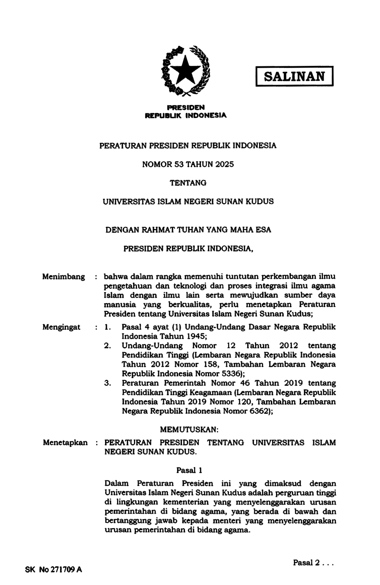 PERPRES Nomor 53 Tahun 2025 | Peraturan Presiden Nomor 53 Tahun 2025 tentang UNIVERSITAS ISLAM NEGERI SUNAN KUDUS