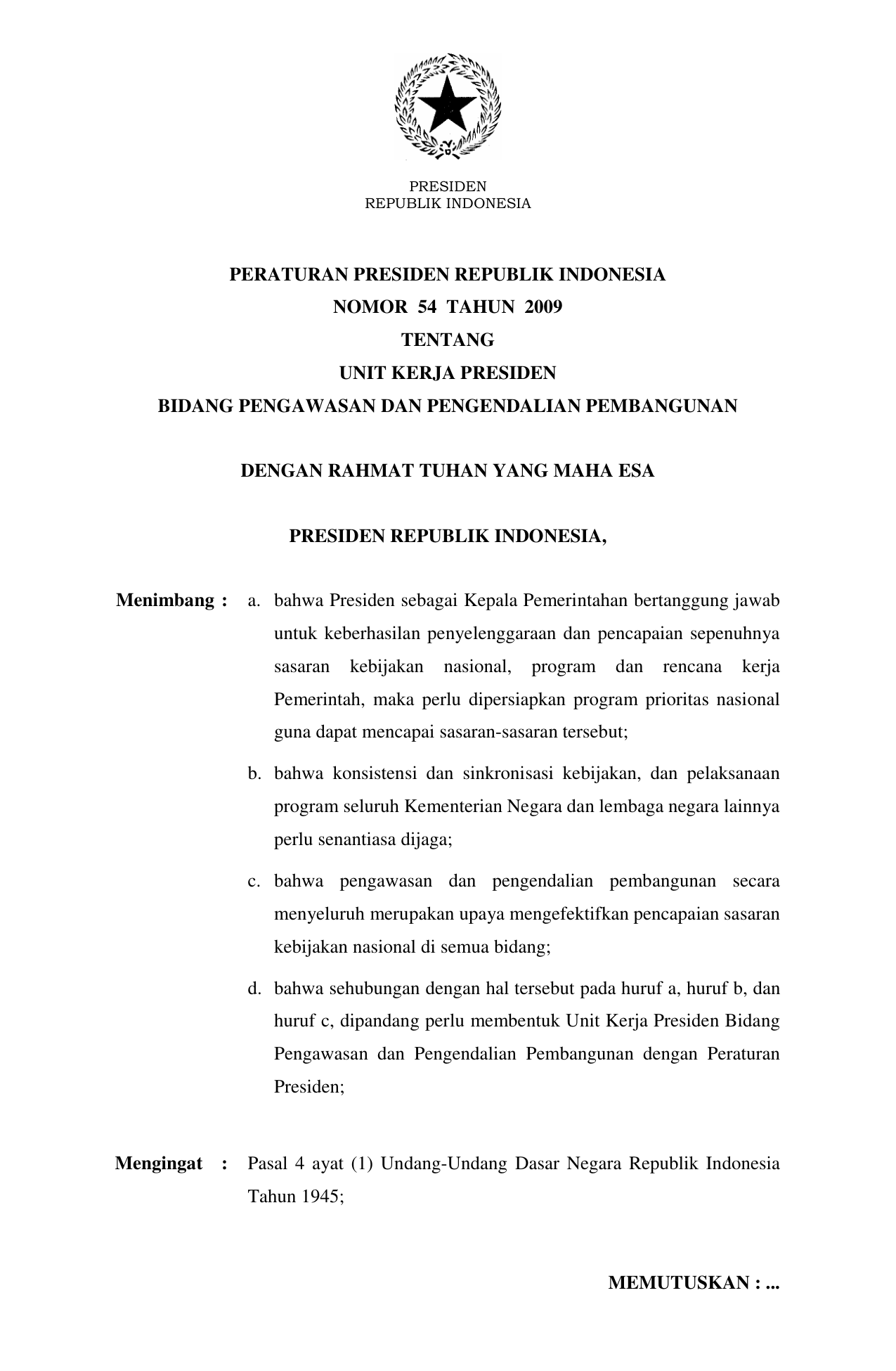 PERPRES Nomor 54 Tahun 2009 | Peraturan Presiden Nomor 54 Tahun 2009 tentang UNIT KERJA PRESIDEN BIDANG PENGAWASAN DAN PENGENDALIAN PEMBANGUNAN