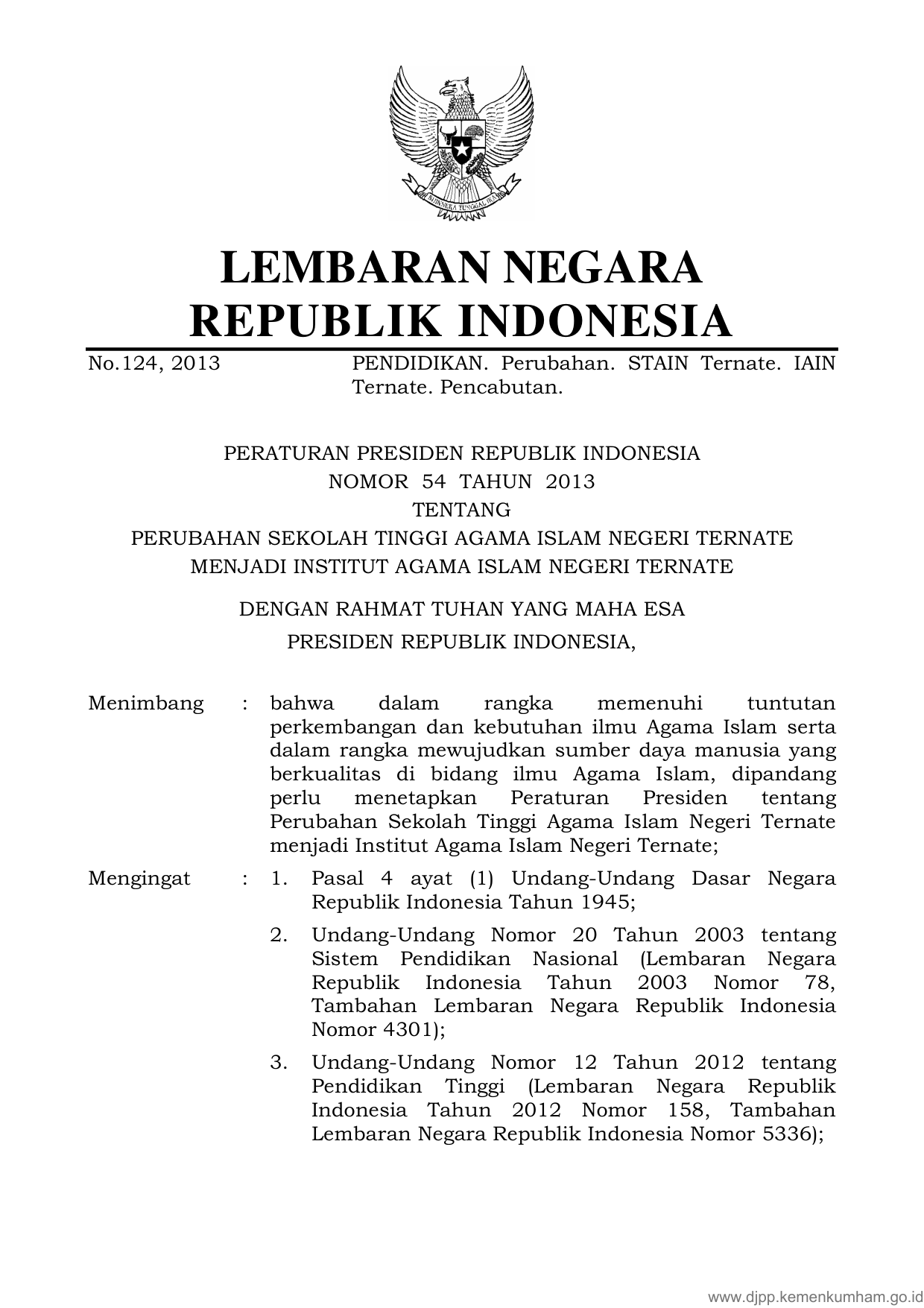 PERPRES Nomor 54 Tahun 2013 | Peraturan Presiden Nomor 54 Tahun 2013 tentang PERUBAHAN SEKOLAH TINGGI AGAMA ISLAM NEGERI TERNATE MENJADI INSTITUT AGAMA ISLAM NEGERI TERNATE