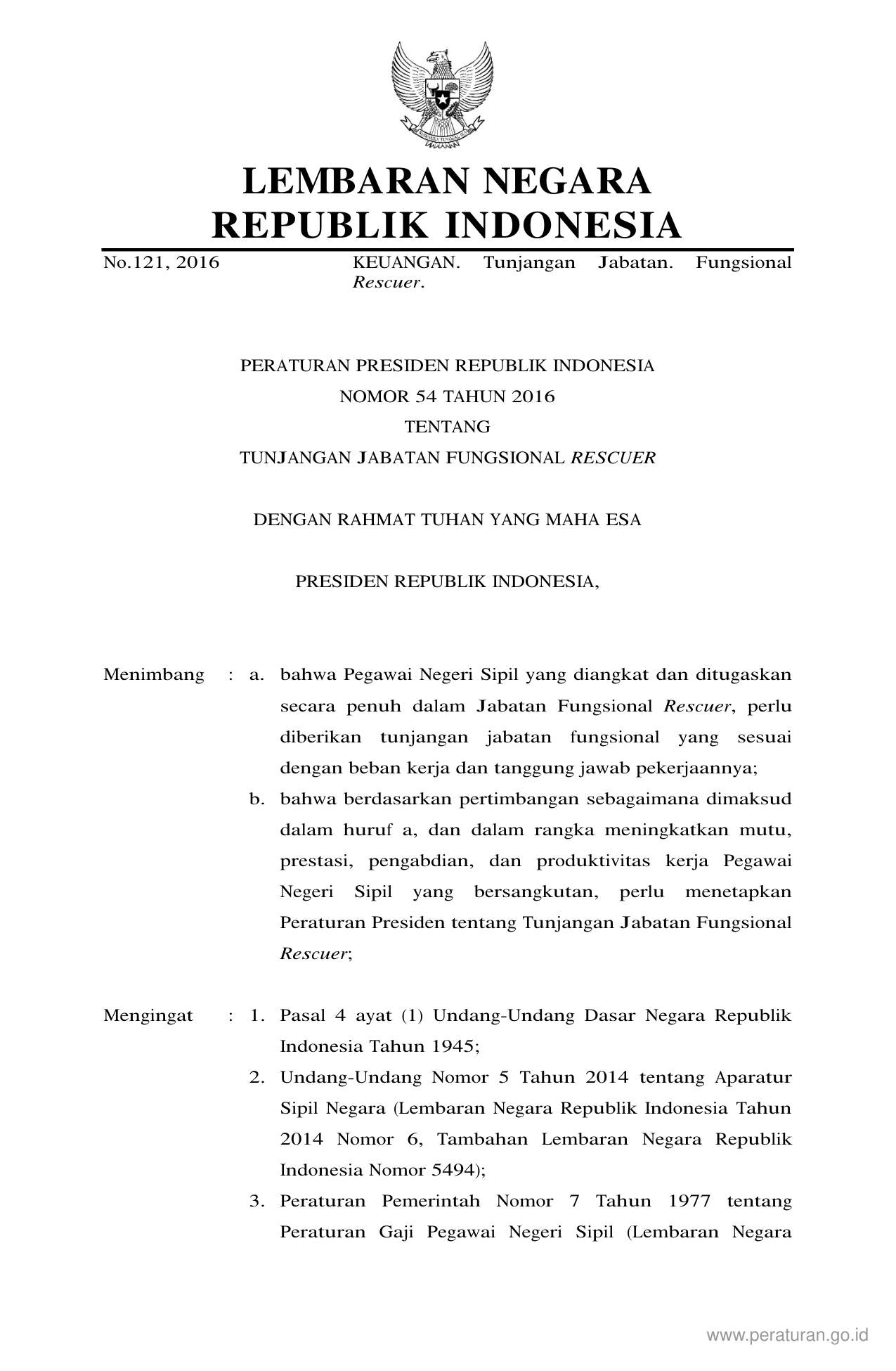 PERPRES Nomor 54 Tahun 2016 | Peraturan Presiden Nomor 54 Tahun 2016 tentang TUNJANGAN JABATAN FUNGSIONAL RESCUER
