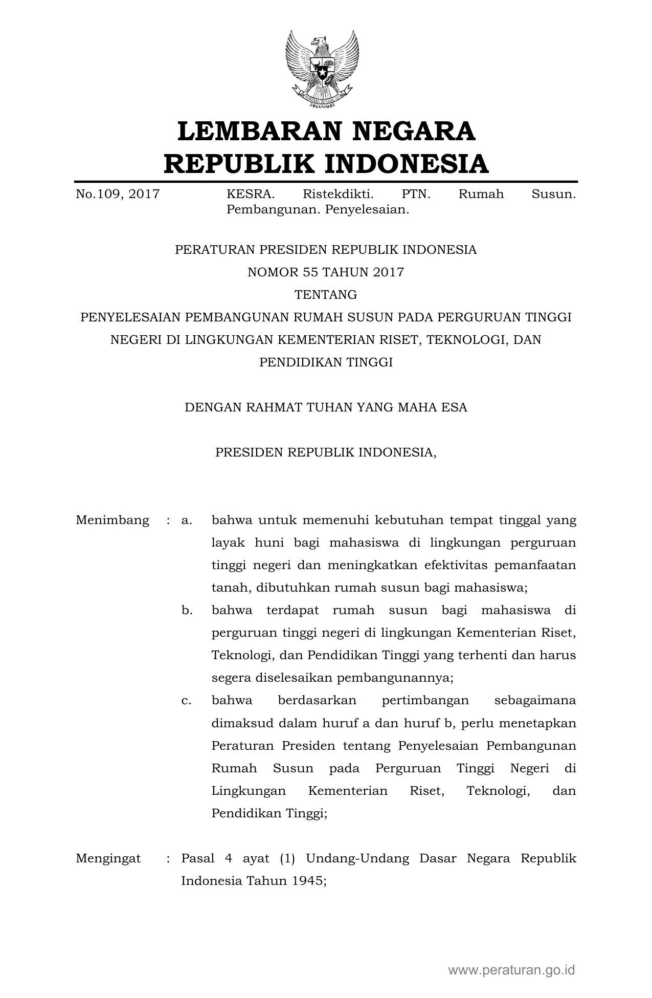 PERPRES Nomor 55 Tahun 2017 | Peraturan Presiden Nomor 55 Tahun 2017 tentang Penyelesaian Pembangunan Rumah Susun pada Perguruan Tinggi Negeri di Lingkungan Kementerian Riset, Teknologi, dan Pendidikan Tinggi
