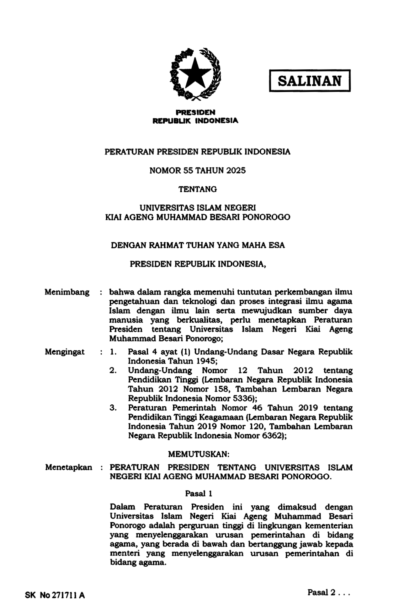 PERPRES Nomor 55 Tahun 2025 | Peraturan Presiden Nomor 55 Tahun 2025 tentang UNIVERSITAS ISLAM NEGERI KIAI AGENG MUHAMMAD BESARI PONOROGO