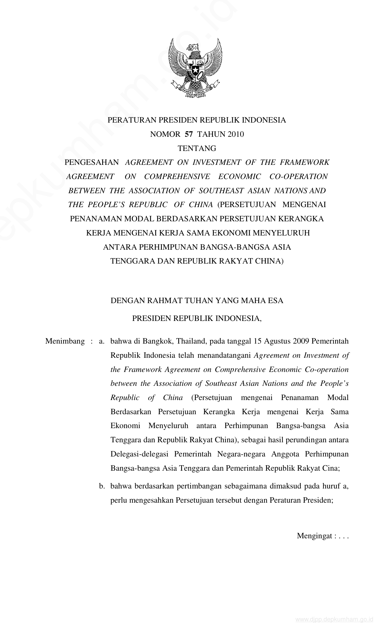 PERPRES Nomor 57 Tahun 2010 | Peraturan Presiden Nomor 57 Tahun 2010 tentang PENGESAHAN AGREEMENT ON INVESTMENT OF THE FRAMEWORK AGREEMENT ON COMPREHENSIVE ECONOMIC CO-OPERATION BETWEEN THE ASSOCIATION OF SOUTHEAST ASIAN NATIONS AND THE PEOPLE'S REPUBLIC OF CHINA (PERSETUJUAN MENGENAI PENANAMAN MODAL BERDASARKAN PERSETUJUAN KERANGKA KERJA MENGENAI KERJA SAMA EKONOMI MENYELURUH ANTARA PERHIMPUNAN BANGSA-BANGSA ASIA TENGGARA DAN REPUBLIK RAKYAT CHINA)