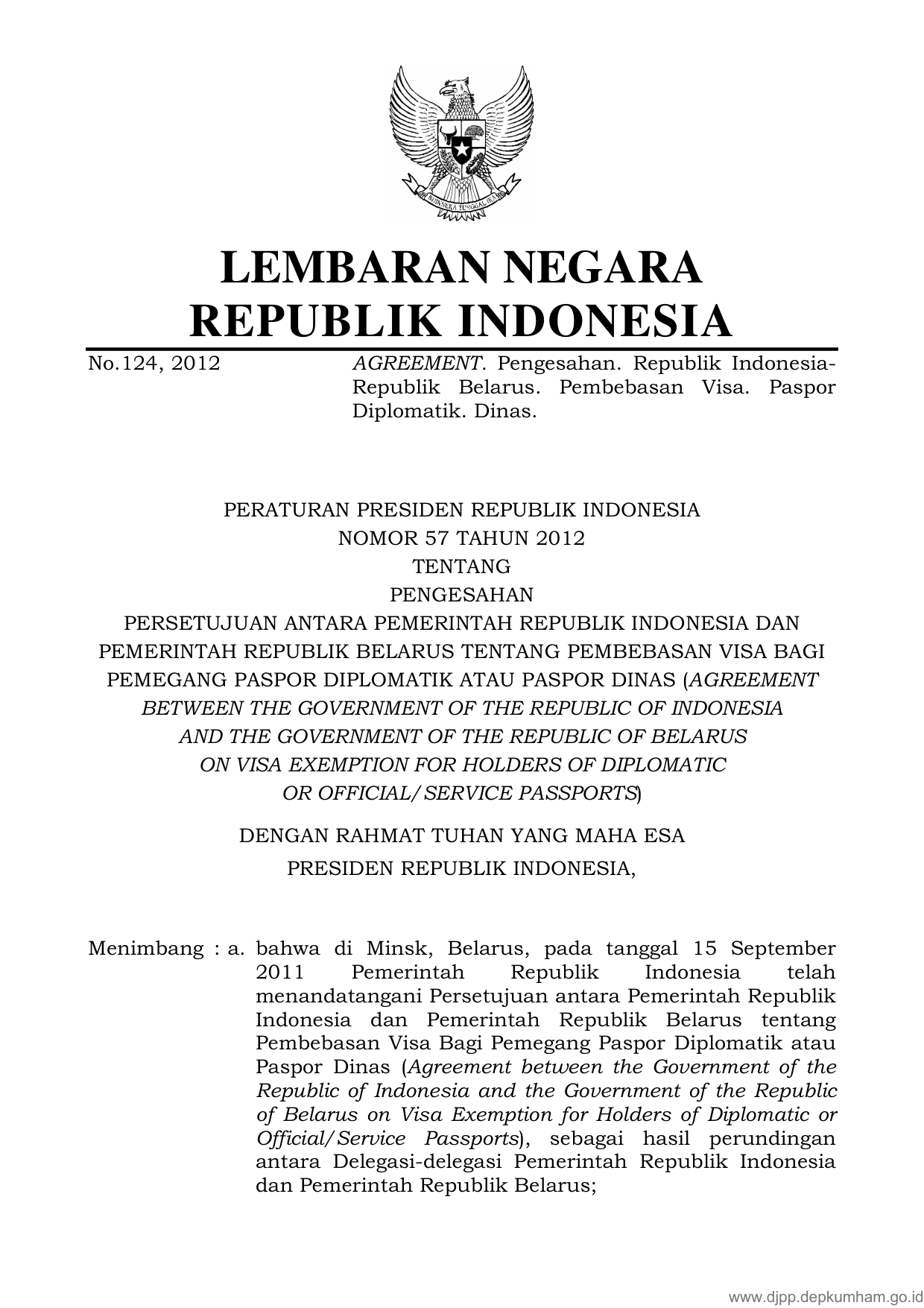 PERPRES Nomor 57 Tahun 2012 | Peraturan Presiden Nomor 57 Tahun 2012 tentang PENGESAHAN PERSETUJUAN ANTARA PEMERINTAH REPUBLIK INDONESIA DAN DEWAN KEMENTERIAN BOSNIA DAN HERZEGOVINA TENTANG PEMBEBASAN VISA BAGI PASPOR DIPLOMATIK DAN PASPOR DINAS (AGREEMENT BETWEEN THE GOVERNMENT OF THE REPUBLIC OF INDONESIA AND THE COUNCIL OF MINISTERS OF BOSNIA AND HERZEGOVINA ON VISA EXEMPTION FOR DIPLOMATIC AND SERVICE PASSPORTS)