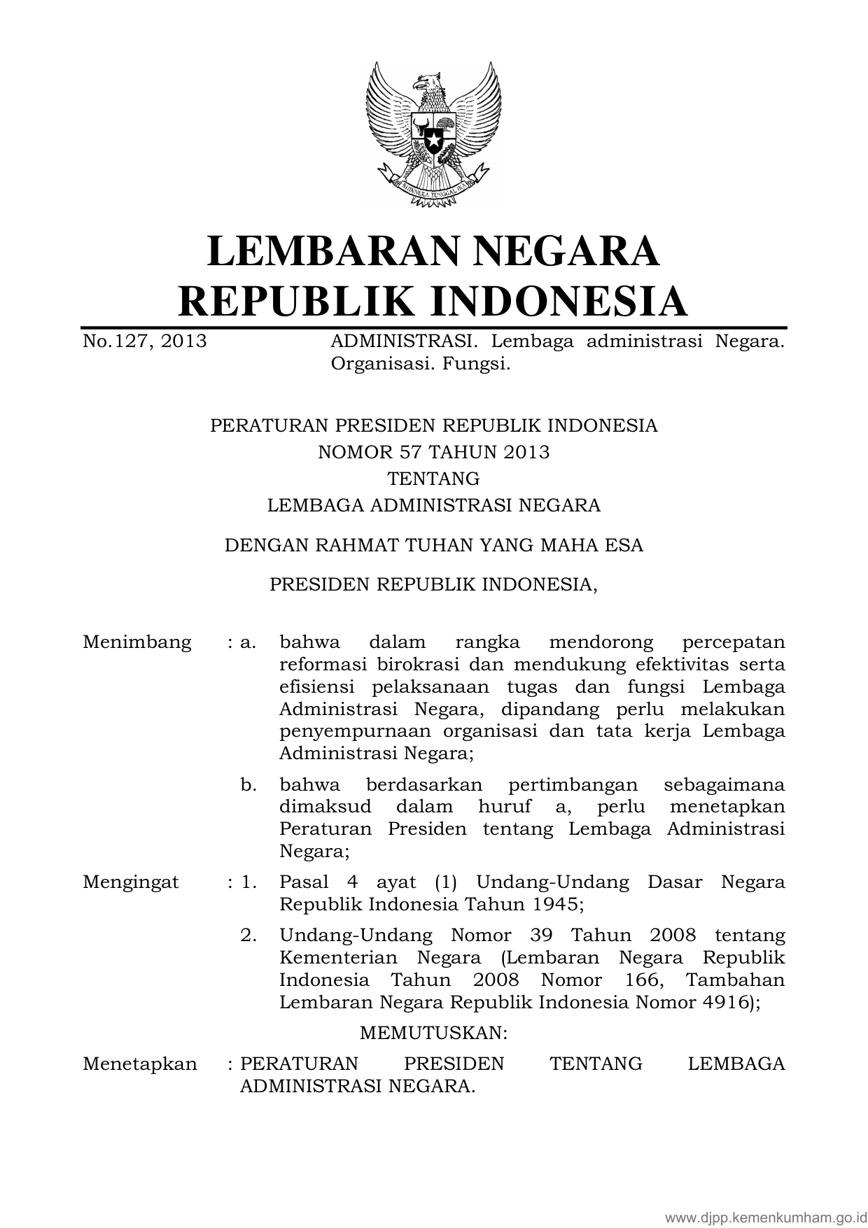 PERPRES Nomor 57 Tahun 2013 | Peraturan Presiden Nomor 57 Tahun 2013 tentang LEMBAGA ADMINISTRASI NEGARA