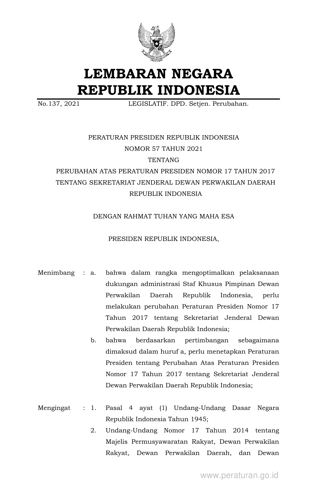 PERPRES Nomor 57 Tahun 2021 | Peraturan Presiden Nomor 57 Tahun 2021 tentang PERUBAHAN ATAS PERATURAN PRESIDEN NOMOR 17 TAHUN 2017 TENTANG SEKRETARIAT JENDERAL DEWAN PERWAKILAN DAERAH REPUBLIK INDONESIA