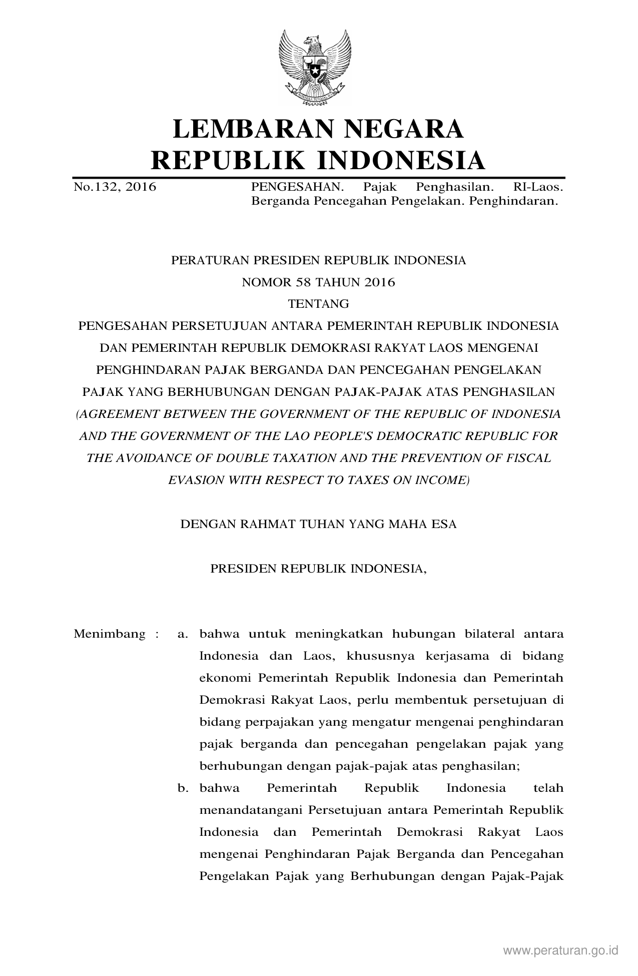 PERPRES Nomor 58 Tahun 2016 | Peraturan Presiden Nomor 58 Tahun 2016 tentang PENGESAHAN PERSETUJUAN ANTARA PEMERINTAH REPUBLIK INDONESIA DAN PEMERINTAH REPUBLIK DEMOKRASI RAKYAT LAOS MENGENAI PENGHINDARAN PAJAK BERGANDA DAN PENCEGAHAN PENGELAKAN PAJAK YANG BERHUBUNGAN DENGAN PAJAK-PAJAK ATAS PENGHASILAN (AGREEMENT BETWEEN THE GOVERNMENT OF THE REPUBLIC OF INDONESIA AND THE GOVERNMENT OF THE LAO PEOPLE'S DEMOCRATIC REPUBLIC FOR THE AVOIDANCE OF DOUBLE TAXATION AND THE PREVENTION OF FISCAL EVASION WITH RESPECT TO TAXES ON INCOME)