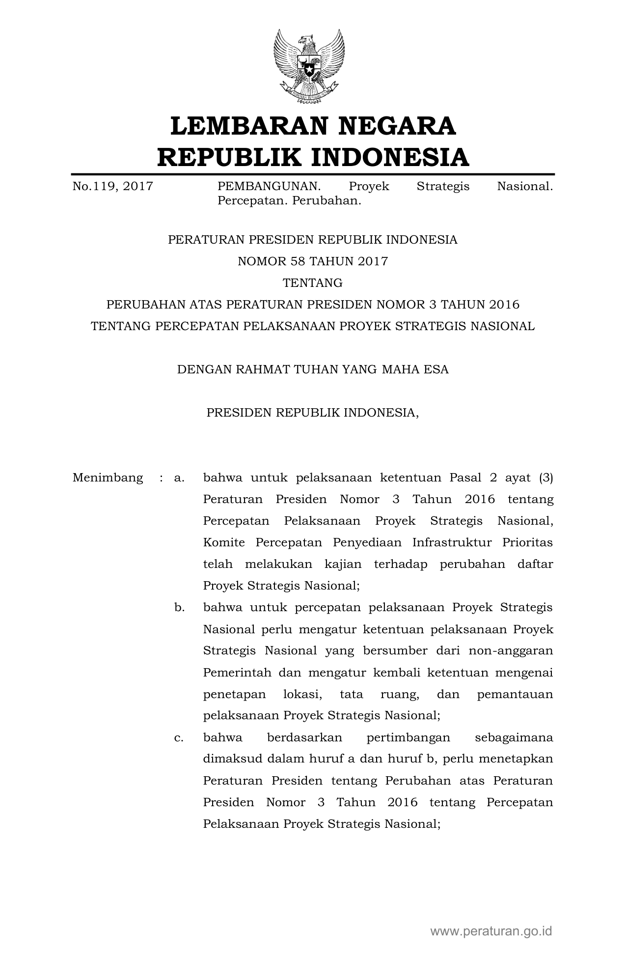 PERPRES Nomor 58 Tahun 2017 | Peraturan Presiden Nomor 58 Tahun 2017 tentang Perubahan Atas Peraturan Presiden Nomor 3 Tahun 2016 tentang Percepatan Pelaksanaan Proyek Strategis Nasional