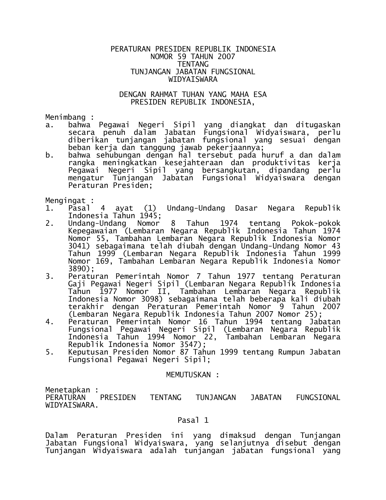 PERPRES Nomor 59 Tahun 2007 | Peraturan Presiden Nomor 59 Tahun 2007 tentang TUNJANGAN JABATAN FUNGSIONAL WIDYAISWARA
