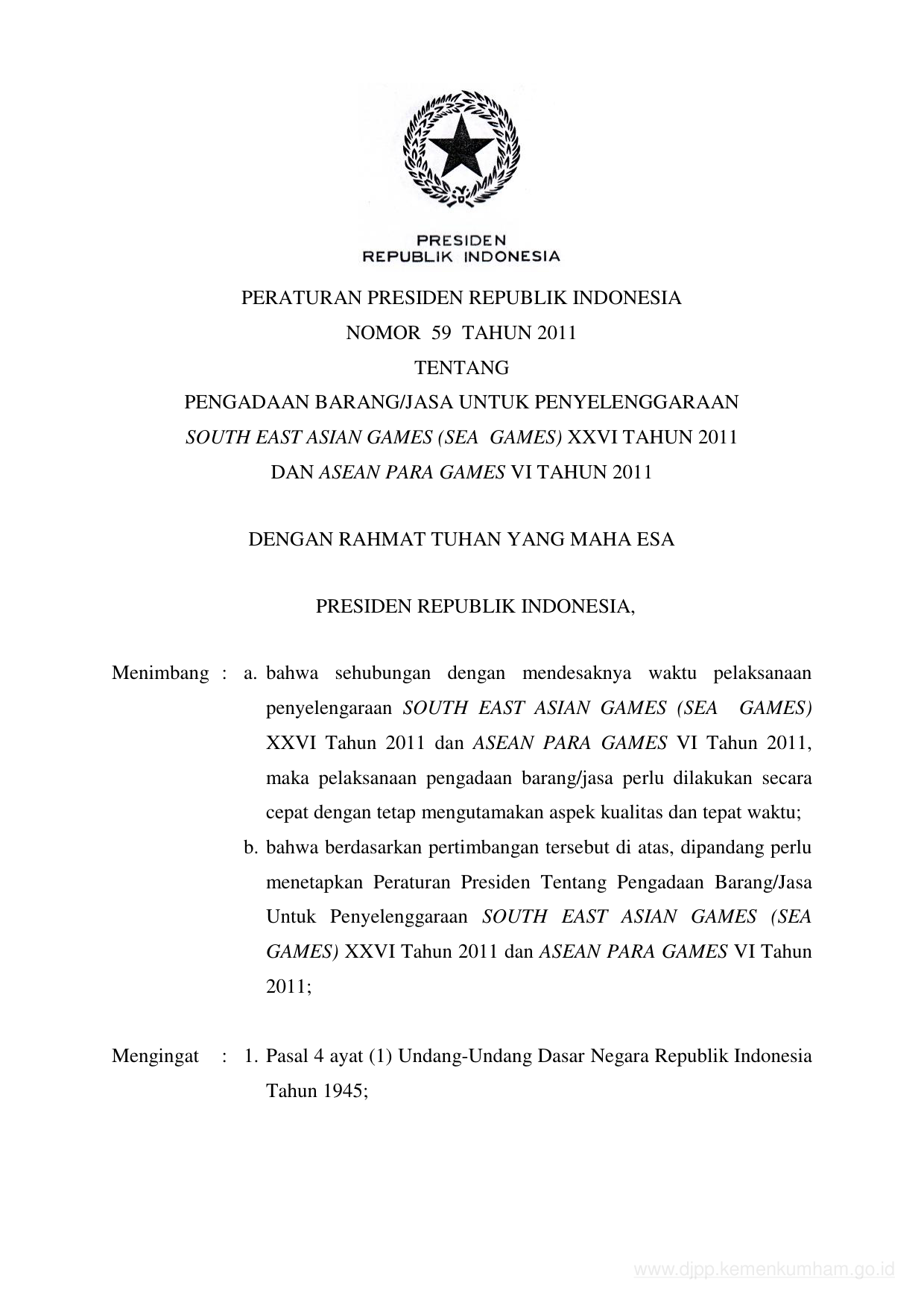 PERPRES Nomor 59 Tahun 2011 | Peraturan Presiden Nomor 59 Tahun 2011 tentang PENGADAAN BARANG/JASA UNTUK PENYELENGGARAAN SOUTH EAST ASIAN GAMES (SEA GAMES) XXVI TAHUN 2011 DAN ASEAN PARA GAMES VI TAHUN 2011