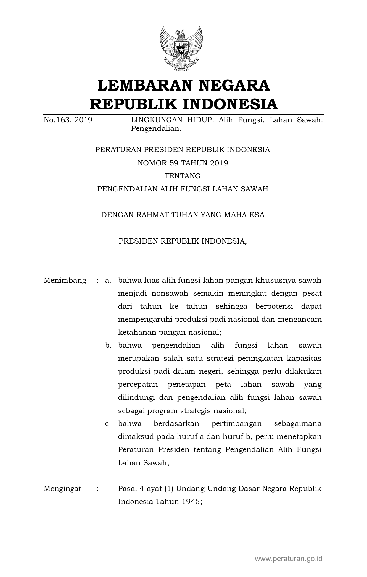 PERPRES Nomor 59 Tahun 2019 | Peraturan Presiden Nomor 59 Tahun 2019 tentang PENGENDALIAN ALIH FUNGSI LAHAN SAWAH