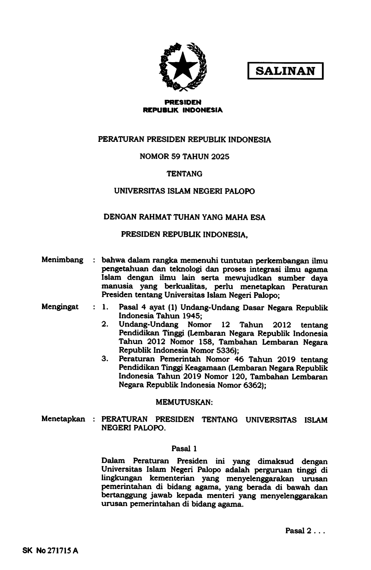 PERPRES Nomor 59 Tahun 2025 | Peraturan Presiden Nomor 59 Tahun 2025 tentang UNIVERSITAS ISLAM NEGERI PALOPO